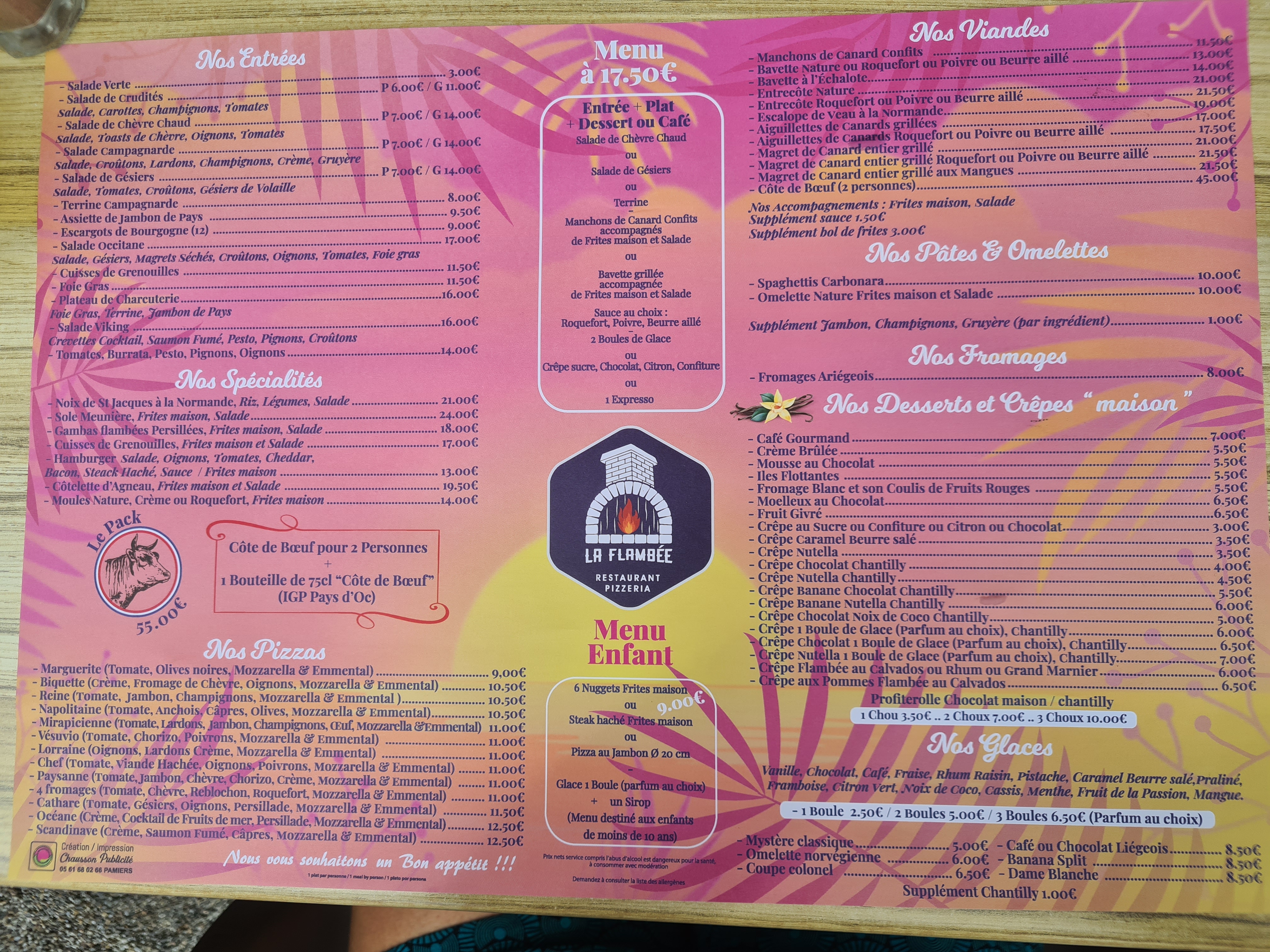 Je vais à La Flambée depuis environ 4 ans maintenant. C'est le restaurant préféré de ma famille dans le quartier de Mirepoix. Le personnel est très agréable et fait de son mieux pour être utile. Je parle français mais je suis heureux de communiquer en anglais. Ils ont des menus en anglais et en français. Le menu a changé récemment, peut-être le chef aussi car la nourriture s'est améliorée. Avec un menu typiquement français, c'est une merveilleuse expérience culinaire. Ne vous attendez pas à un restaurant parisien de premier ordre, c'est la France rurale dans l'une des régions les plus pauvres de France. Proposant des cuisses de grenouilles, des escargots, des salades de fromage de chèvre, des steaks de striplion et de faux-filet et des cuisses de duk confirment, quelques-uns du menu. Une belle expérience culinaire dans un cadre traditionnel de la ville médiévale de Mirepoix offrant un excellent rapport qualité/prix.