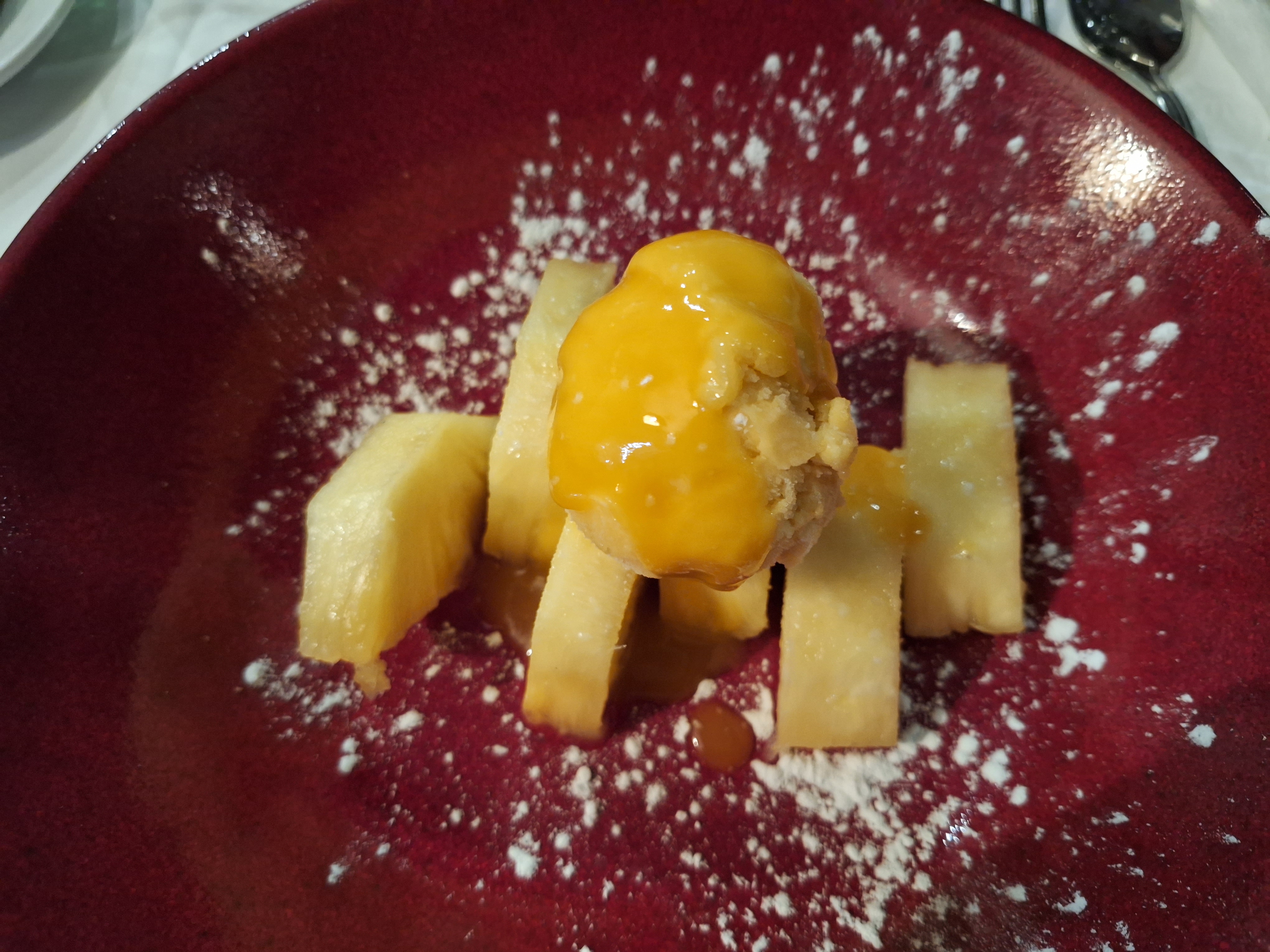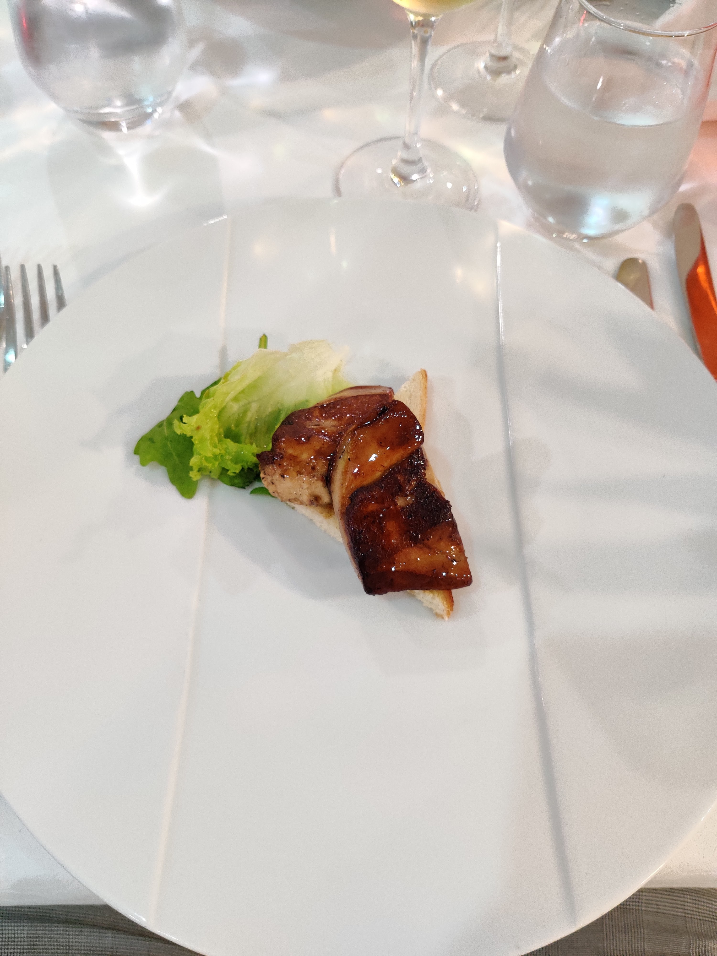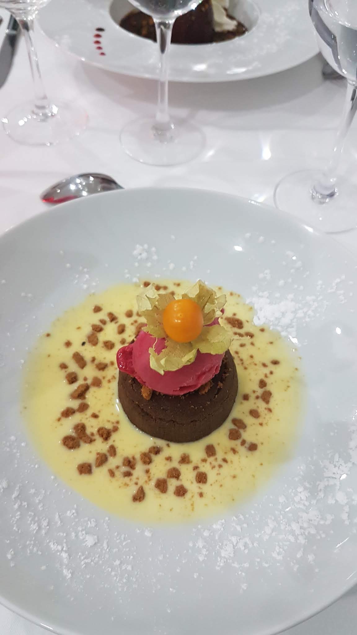 Les goûts sont là. Foie gras poêlé bien , plat de st jacques à la parisienne copieux. Purée un peu posée là au hasard sans l'assiette . Carpaccio d'ananas qui n'en était pas un. Ananas coupé en cubes assez grossièrement Service et décor un peu glacial