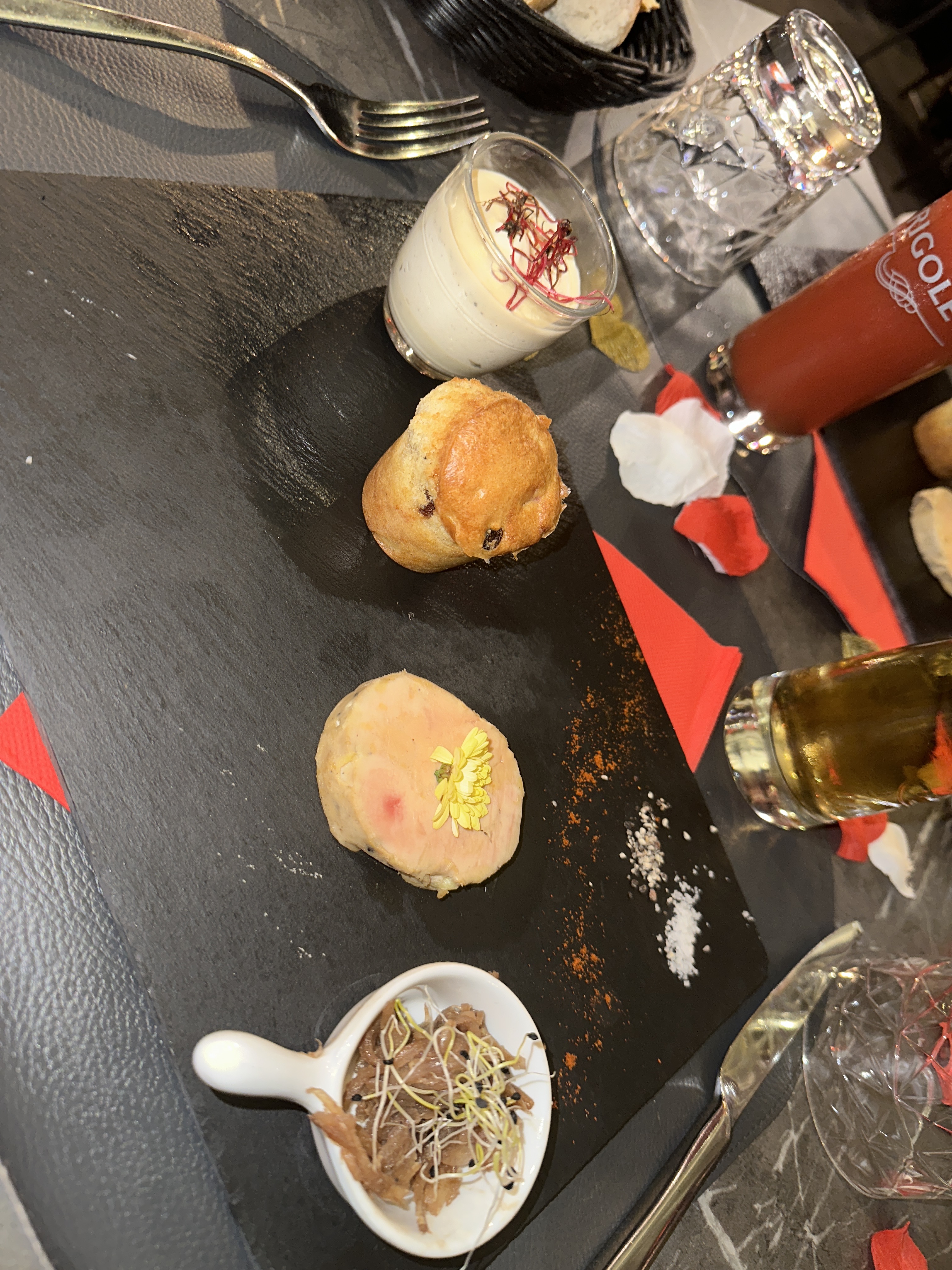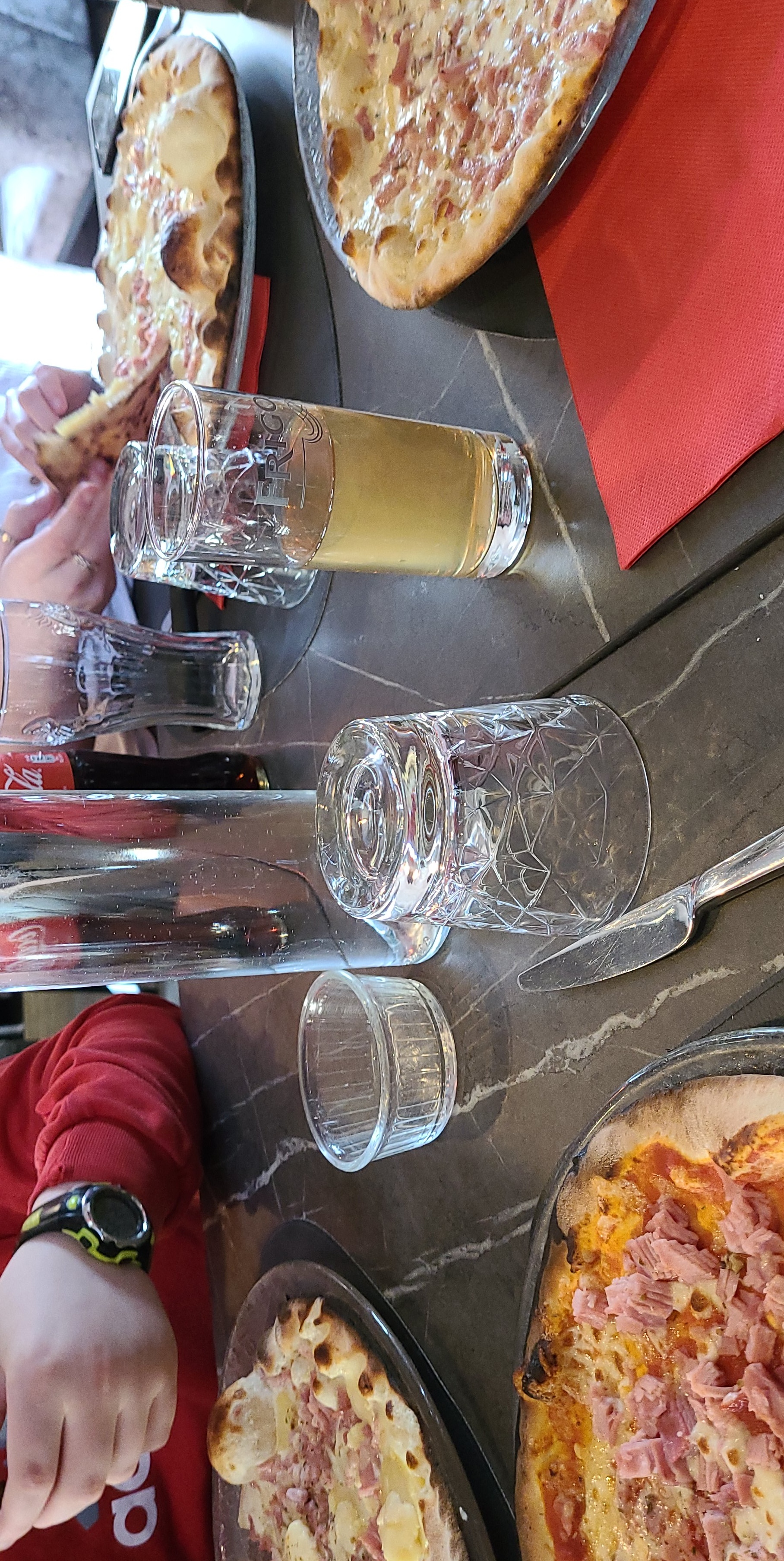 Pas trop mal mais ! Trop d’échalotes dans l’entrée… Le serveur s’est trompé de pizza… En attendant le dessert, c’était bon quand même. Ah oui j’ai pu d’eau à la table 4. Merci bisous à bientôt 😘 Pas: on a le Covid