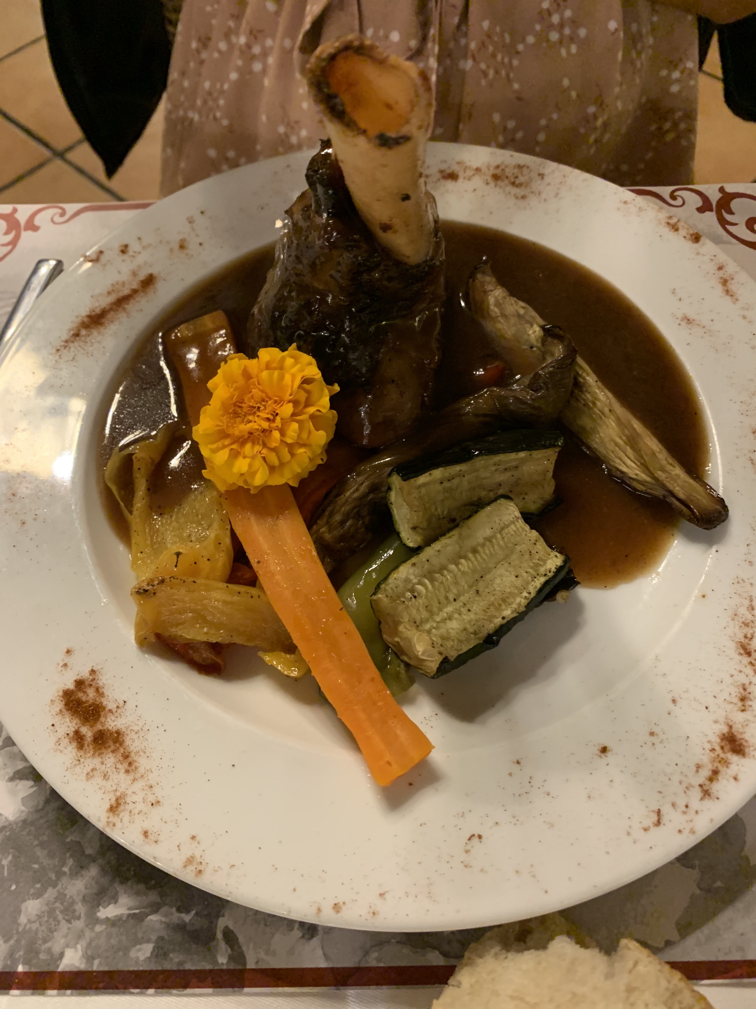 Nourriture horrible. Le steak de bœuf était probablement fabriqué à partir de pneu plutôt que de vache. Je ne pouvais pas du tout le mâcher, j’ai laissé la moitié du repas entier. Les pommes de terre étaient bonnes, la sauce pour le steak était juste de l'eau avec de la graisse… Le steak de mon ami était censé être bon et il était plus cru que le mien… l'agneau de mon petit ami était sans sel, sans poivre et très difficile à mâcher également. Les légumes n'étaient pas non plus très bons. Ma bonne chose était la baguette - probablement fabriquée par une boulangerie et du vin locaux - également auprès d'un fournisseur local. J'ai lu les critiques après avoir commandé et je suis d'accord avec les points négatifs. Après l'entrée, la dame a pris l'assiette vide et a laissé des couverts sales sur la table, ils ont été changés après que nous l'ayons demandé.