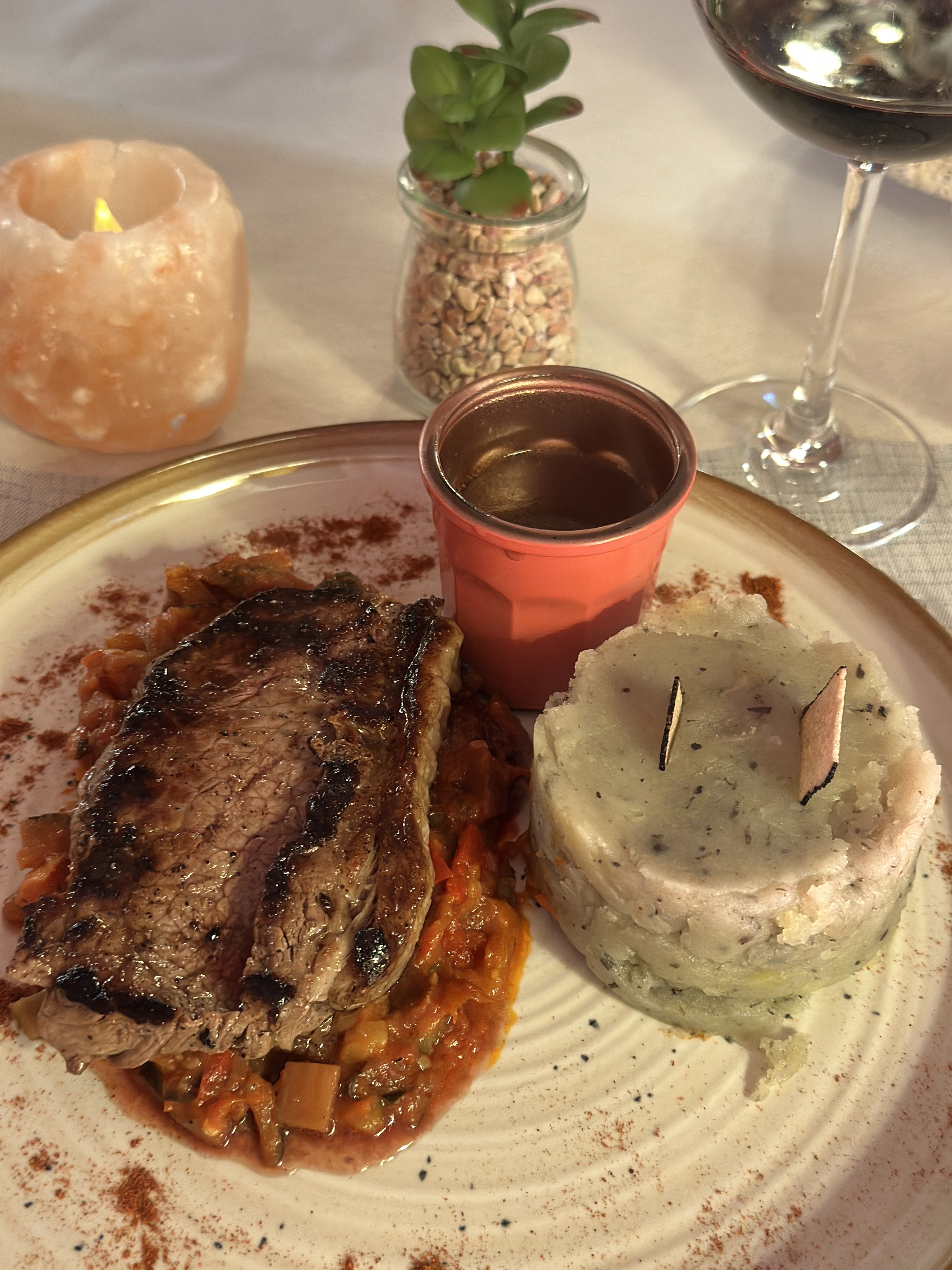 Je suis contente que nous ayons décidé de dîner dans ce restaurant situé un peu à l’écart du centre habituel de Grasse. À mon avis, cela rend le restaurant encore plus spécial. Je recommanderais fortement aux touristes et aux locaux de faire un léger détour et d'essayer ce restaurant. Le service était impeccable. Le gars qui a pris notre commande était extrêmement attentif et a fait tout son possible pour répondre aux besoins des clients. Pour commencer, les starters étaient complémentaires. Les plats principaux étaient également délicieux, le serveur a même suggéré de modifier la sauce du steak à notre goût si elle était trop épicée. Le poisson était bien préparé avec de la purée de pommes de terre à la truffe et des légumes en accompagnement. Je recommanderais fortement le gâteau au Nutella avec de la glace à tout moment - c'était la meilleure façon de terminer votre repas. J'ai tout simplement adoré ! Nous avons terminé notre superbe dîner avec un digestif - tout simplement incroyable. Je recommande vivement ce restaurant à tout moment. Je reviendrai certainement 👍🏻