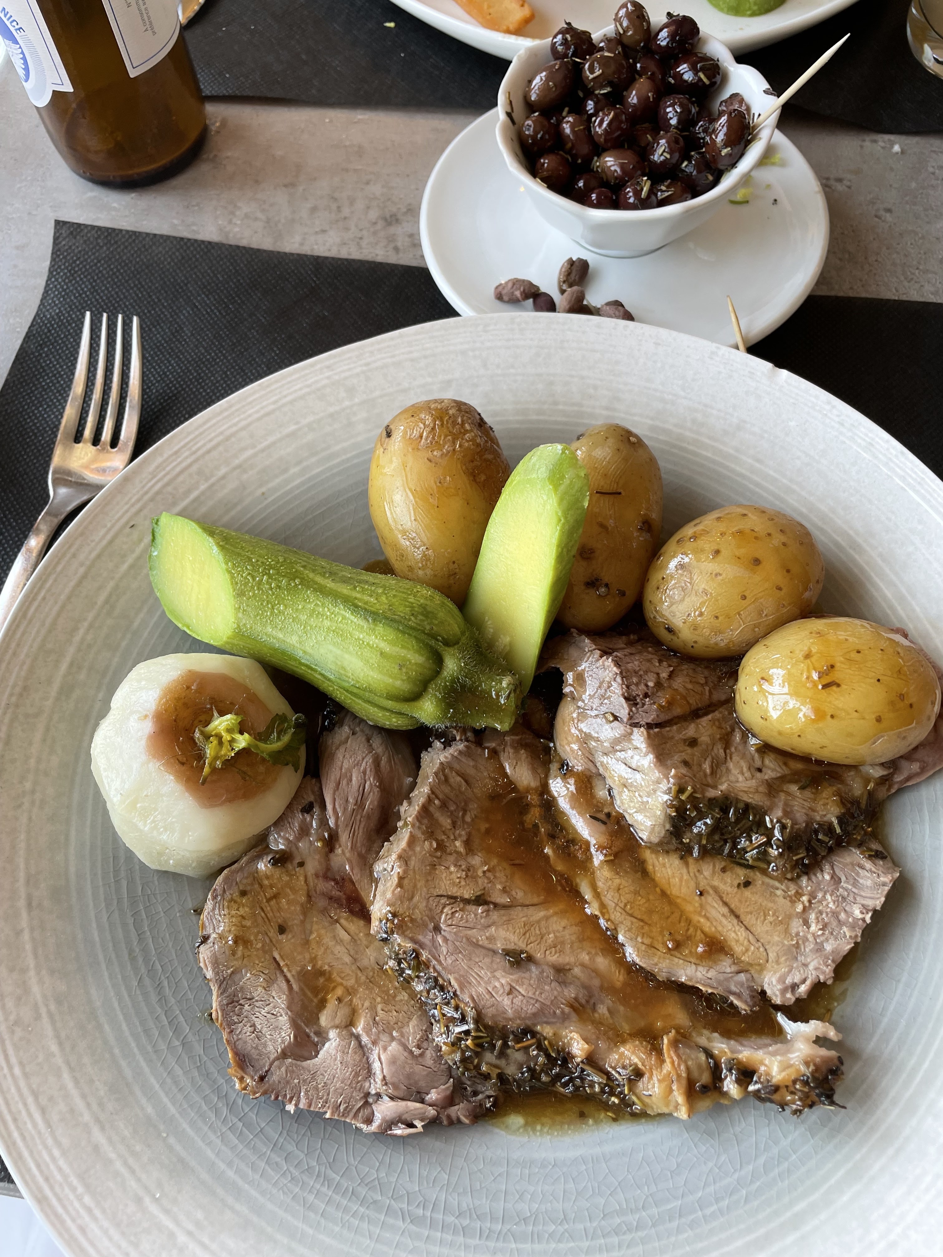 Accueil sympathique, salle agréable et fraîche, ambiance sonore plaisante d’un jazz léger. Viandes moelleuses, assaisonnements agréables et ajustés. Une tarte fine artichaut truffe d’été, une pièce de veau aux olives et aux câpres, accompagnée de gnocchis typiques du pays, de pomme de terre et de blette. Pour le dessert, une crème brûlée goûtée, quetsche pain d’épices. Bref, c’est bien, et même franchement mieux que plusieurs d’adresses niçoises pourtant mieux notées…