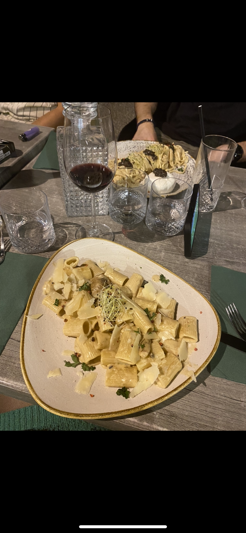 On a vraiment bien tous très manger et bu ! Je recommande fortement ✨ En bord des quais, bonne ambiance. J’ai commandé les Rigatoni funghi (pâtes au cèpes et parmesan) et la personne en face des Pasta al tartufo (pâtes crème de truffe et copeaux de truffe). Pour ma part, il manquait un peu de pâtes dans mon assiette car j’avais encore un peu faim. Mais je devais sûrement avoir un gros appétit ce soir là. 😊