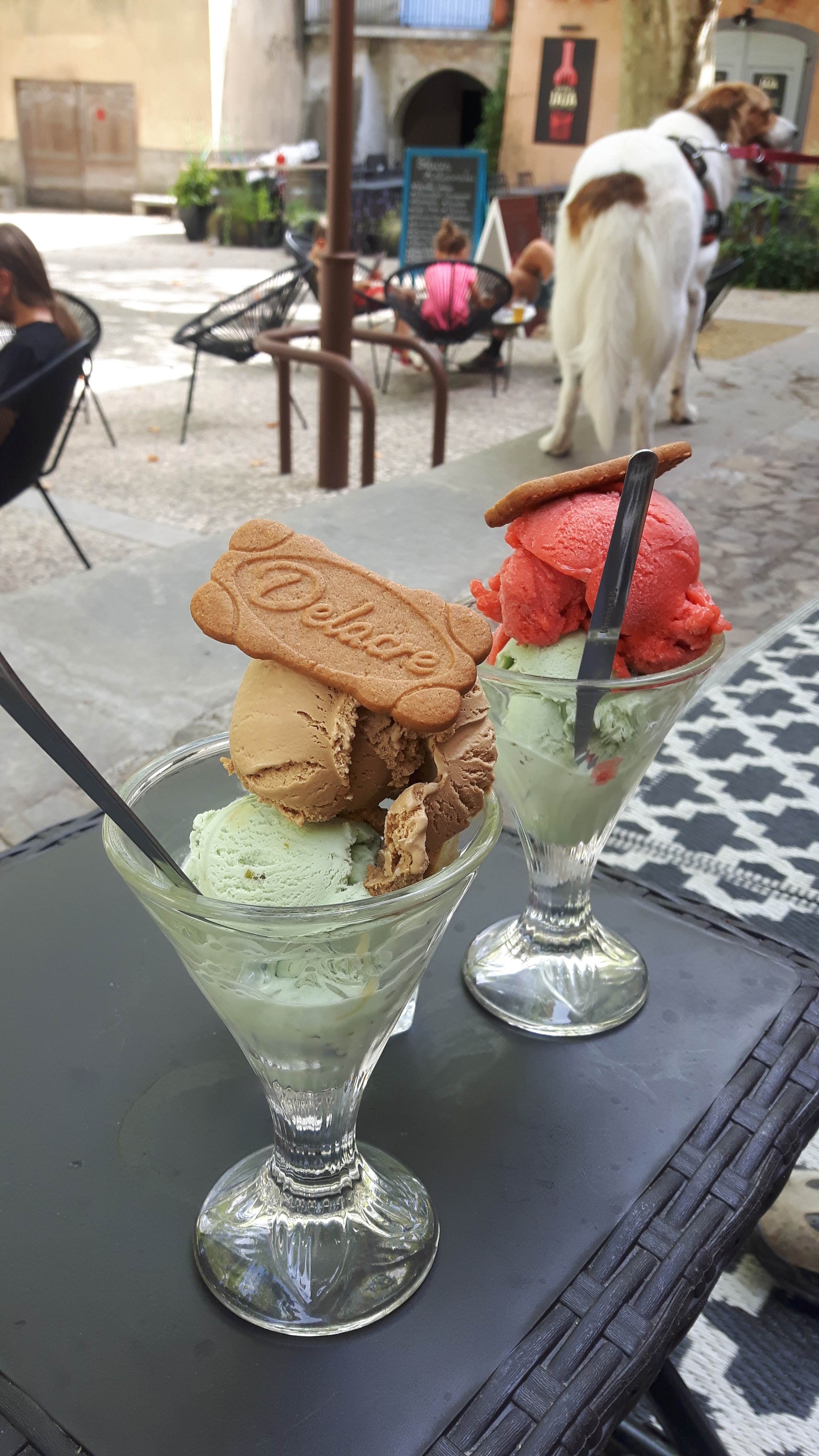 Des glaces délicieuses servies avec générosité sur la jolie place du village de Sauve !