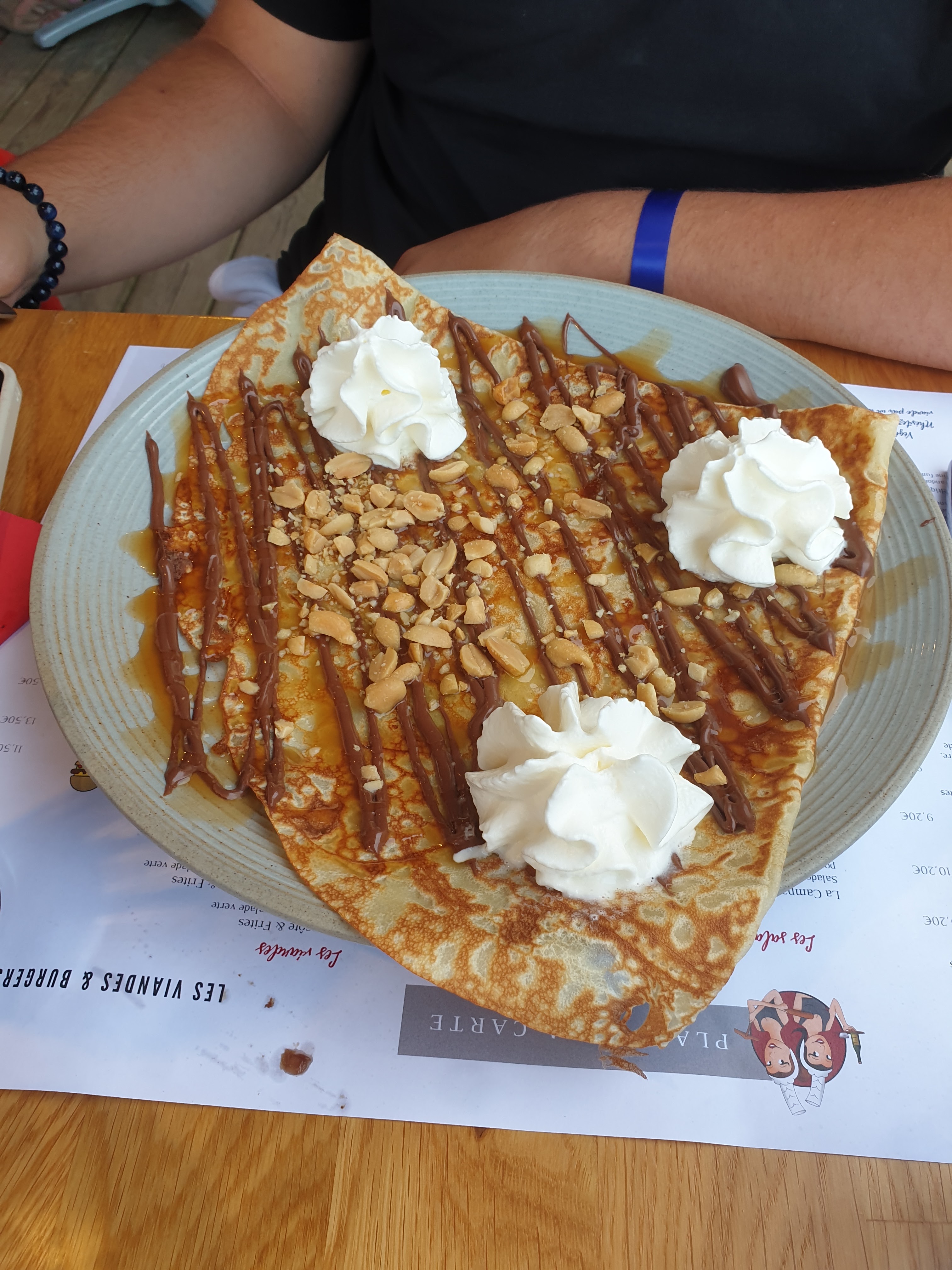 Crêperie, moules, burger, glaces. Tout était très bon. Moules au curry 😊😊 Repas bien sympathique. Terrasse vraiment très agréable. Nous n'avions pas réservé nous avons eu une une place dehors. Personnel très gentil.