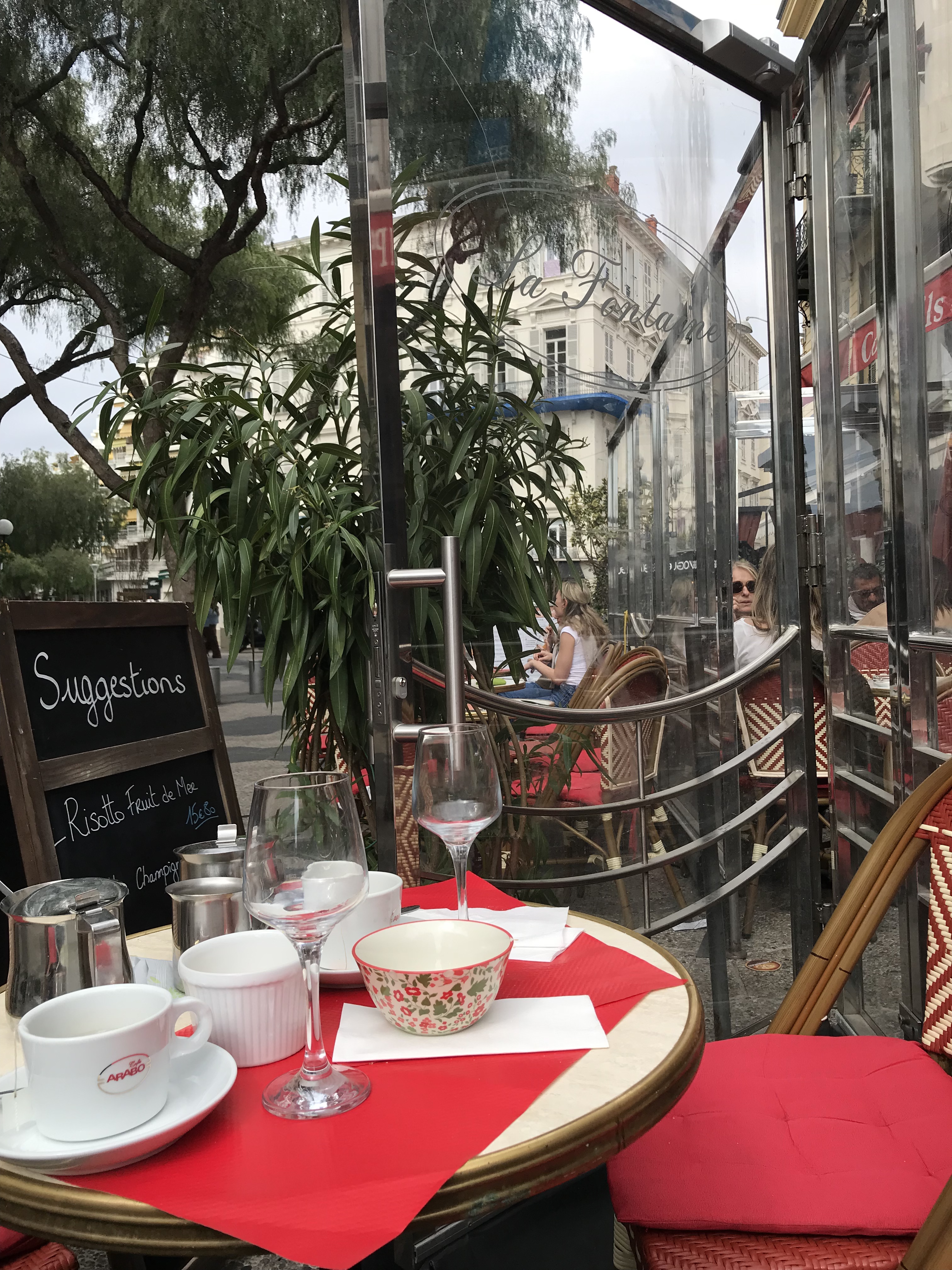 Très bien situé, dans le quartier commerçant haut de gamme de Nice, France. Rue piétonne, personnel très sympathique et excellent choix de plats. Gros plus ! Les radiateurs en hiver le gardent confortable.