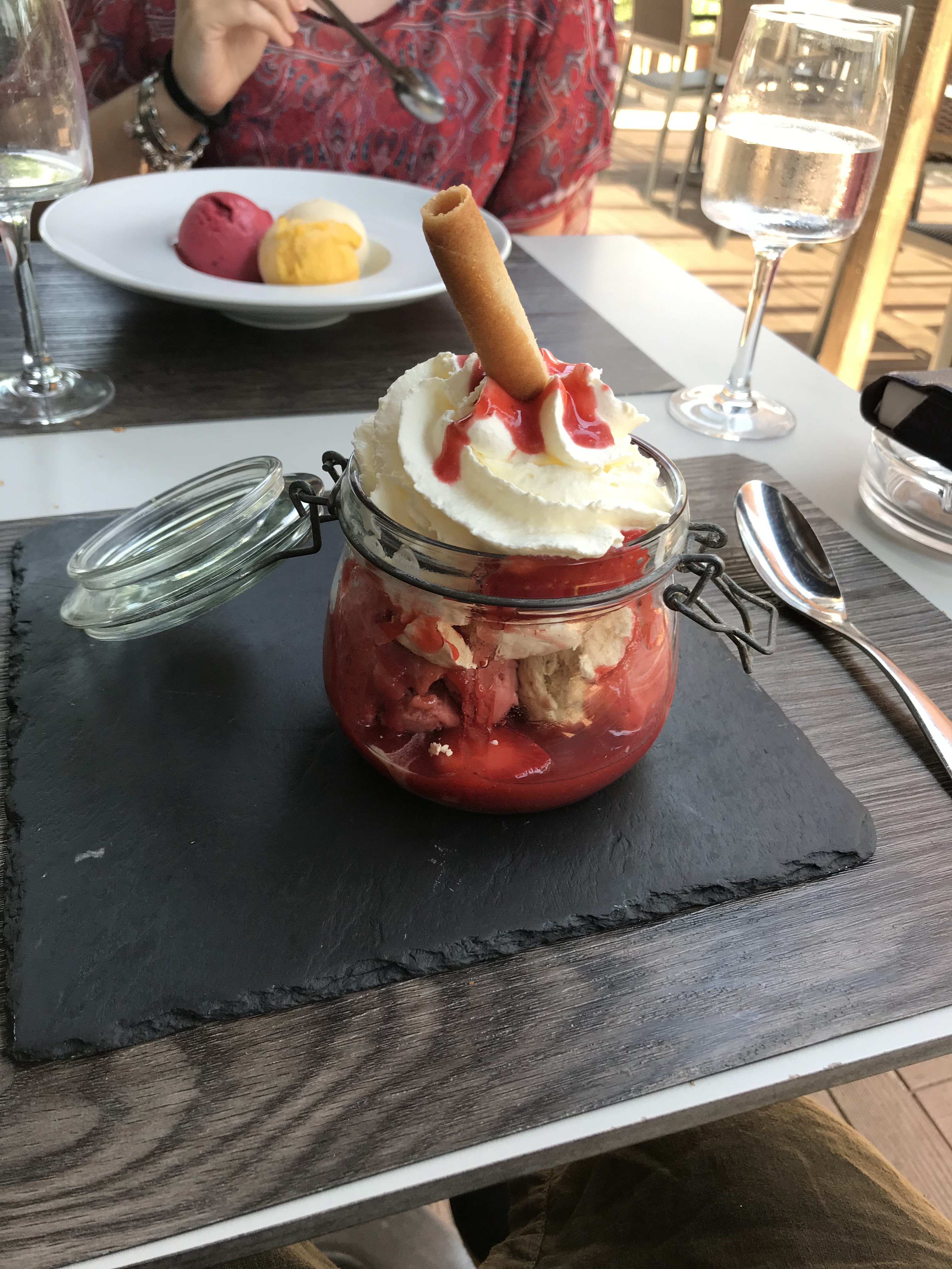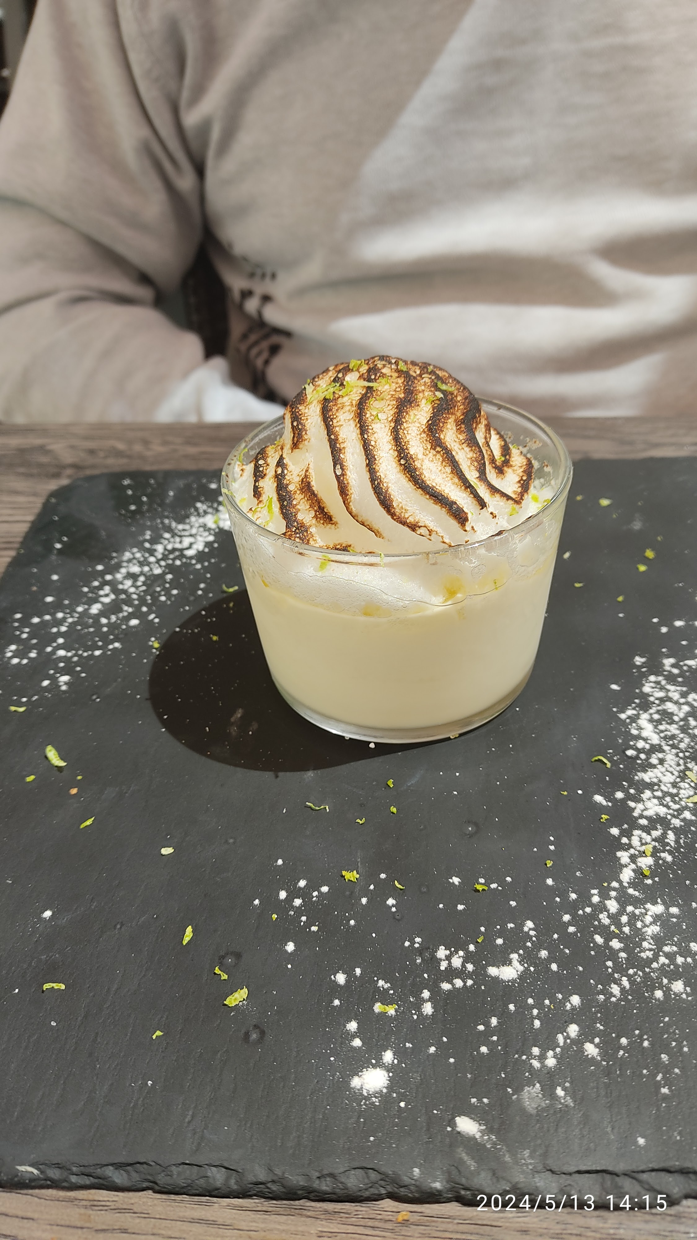 Cadre en terrasse parfait, repas excellent. Tatin de saumon, canneloni aux joues de boeuf, cuisse canard confit, filet de loup, panna cotta citron , moelleux chocolat . Personnels charmants et très aimable.