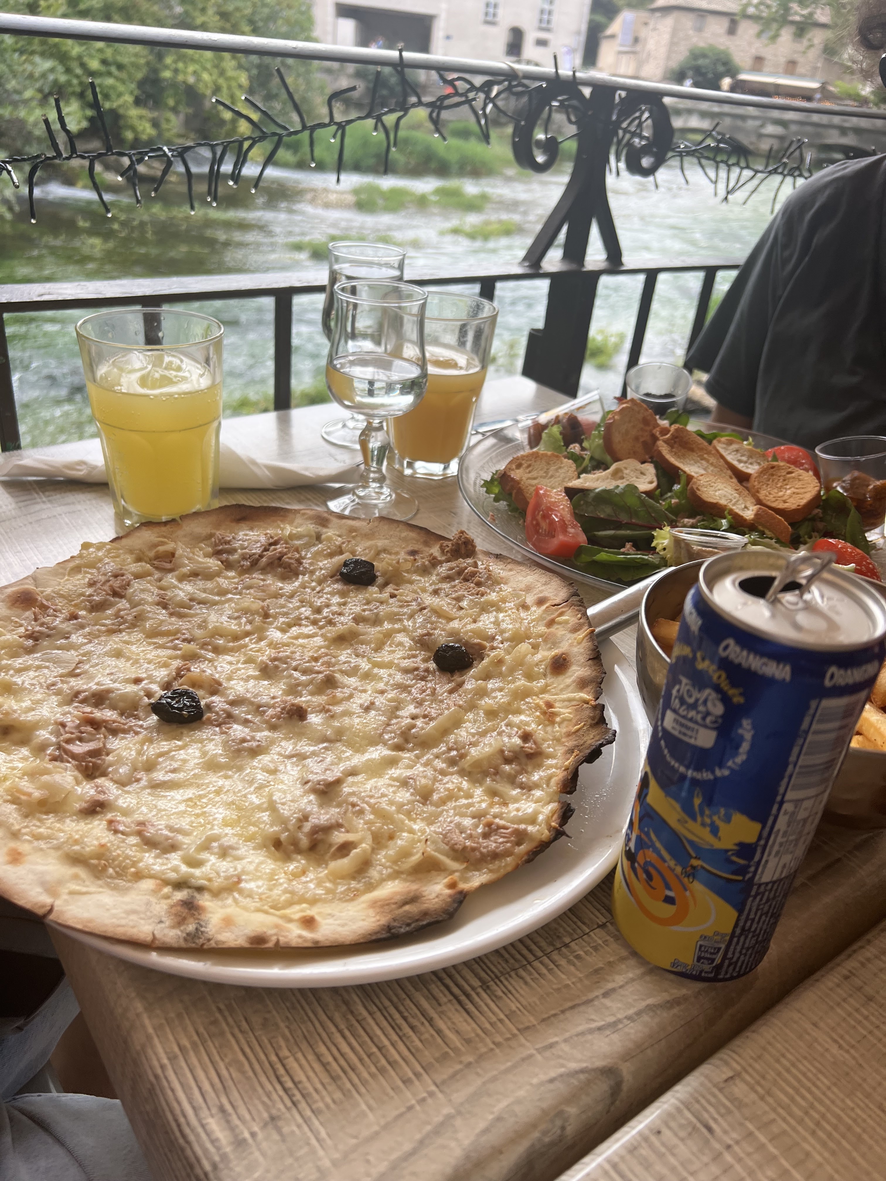 Première fois dans ce restaurant et ce n'est pas du tout concluant , les pizzas qui ne sont pas fait maison sont fades et la pâte très dure, les frites sont arrivées froides, j'ai pris une gaufre en dessert qui avait le gôut du carton ( du réchauffé) quant à l'ambiance le bruit de la sorgues est assourdissant . Je trouve que ce restaurant est cher par rapport à la nourriture qu'il sert .Le service est à la hauteur des plats qu'ils servent 0/10.Bref je ne recommande absolument pas ...