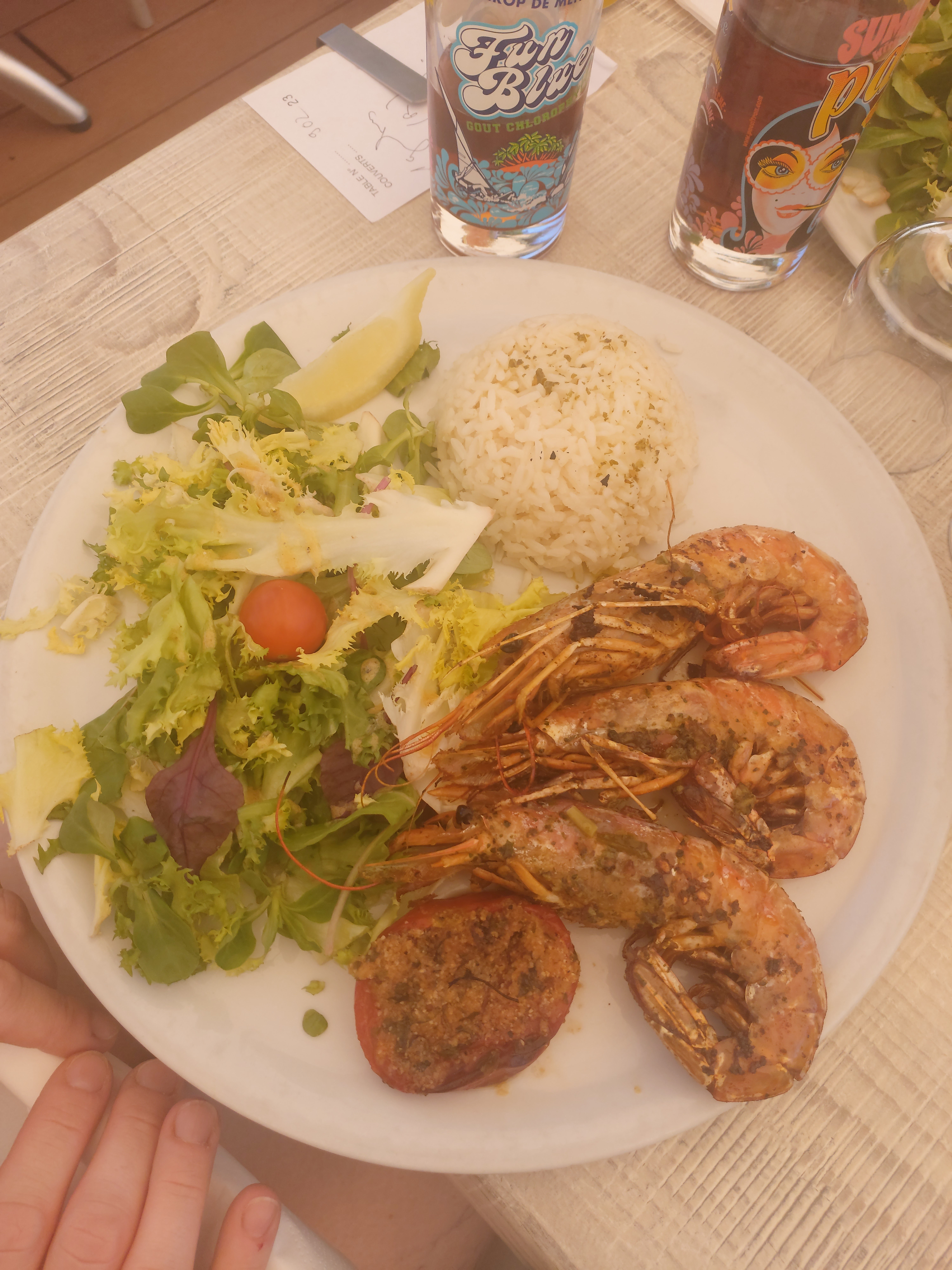 On a mangé à midi entre amis. On a pris des gambas. C'était dégueulasse, des combas surgelés, sec. Le plat était censé être servi avec du riz mais le serveur nous dit qu'il y a plus de riz. Donc on a finit avec 3 gambas, 2 feuilles de salade qui se bat en duel et des frites immangeable.