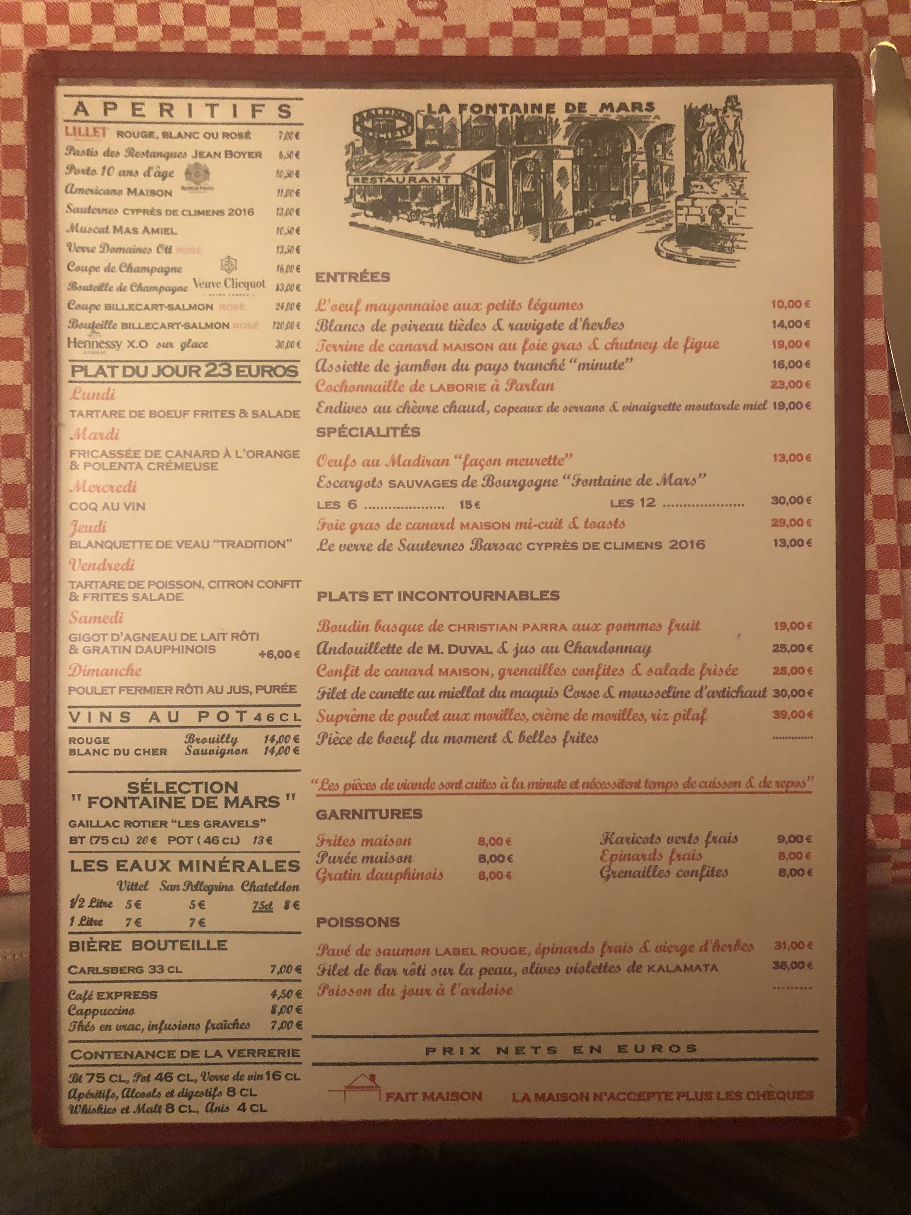 La Fontaine de Mars est mon restaurant de famille. J'y vais depuis que je suis enfant et la qualité des plats est toujours au rendez-vous. J'ai été déçue une seule fois sur les cinquante où je suis venue. Le chef n'était sans doute pas là ce jour là . Ce restaurant a un charme inégalé, je m'y sens à la maison. J'adore les serveurs et je ne saurais recommander un seul plat tellement ils sont tous excellents. Je prends souvent les suggestions du chef qui sont des plats de saison cuisinés avec amour. Tous les desserts sont exceptionnels, mention spéciale à la coupe de fraises au sabayon pistache. Foncez-y! Mais ne me prenez pas ma table 😜