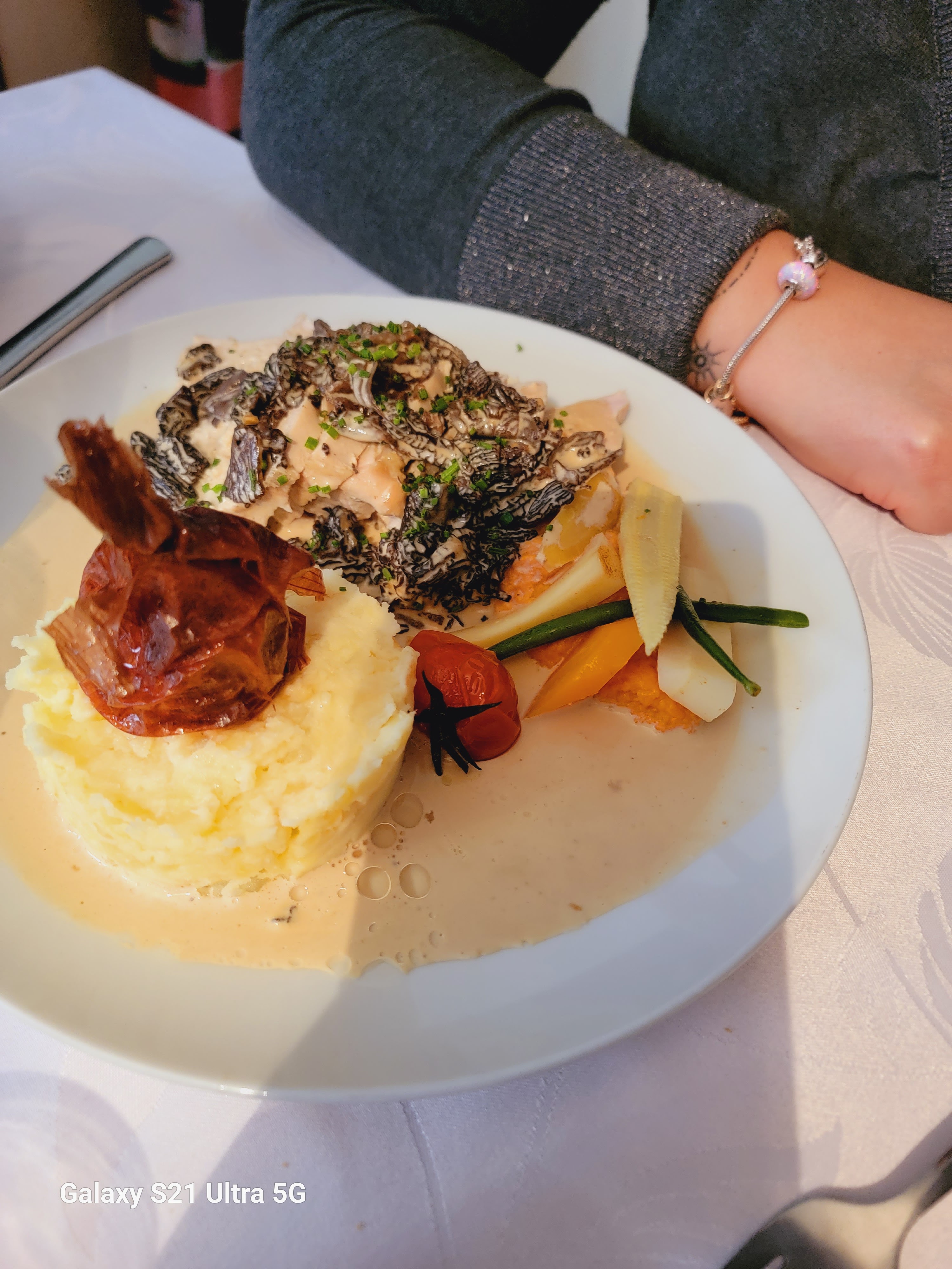 Nous avons pris 4 plats en terrasse, très bon service, produits de qualité et frais ce qui justifie un prix un peu élevé. Croûte aux morilles savoureuse.