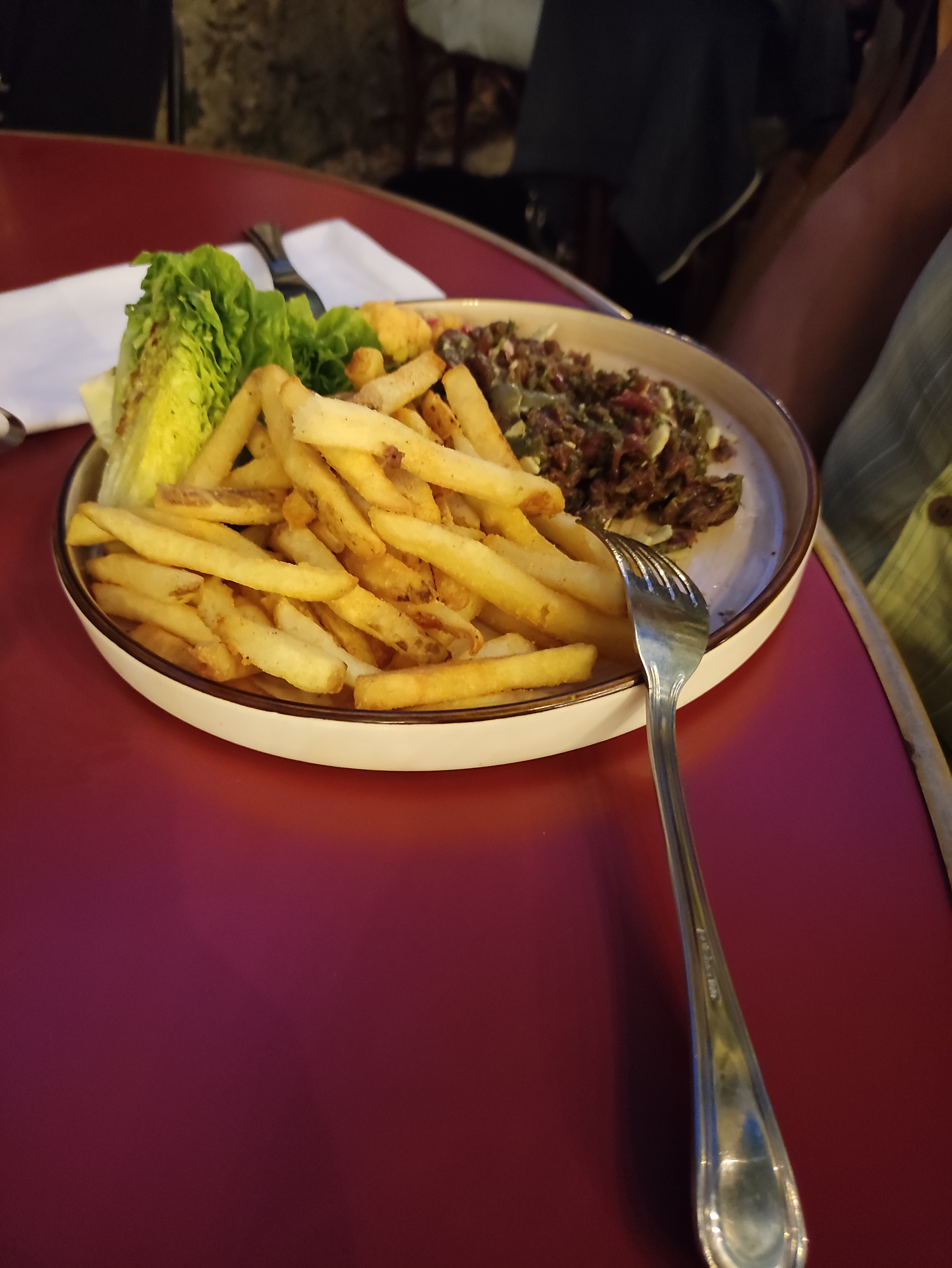 Tres très déçue, nous avions réservé et ...attente de 1h 30 avant d'être servi. Sans aucune escuse.. 10 frites dans l'assiette .avons demandé une portion supplémentaire qui n'est jamais arrivée. De 13h45 à 16h pour manger un tatare /frites. 😔😔.pas de pain.. nous nous faisions une joie de manger en ce lieu...le snack est plus rapide et efficace apparemment.