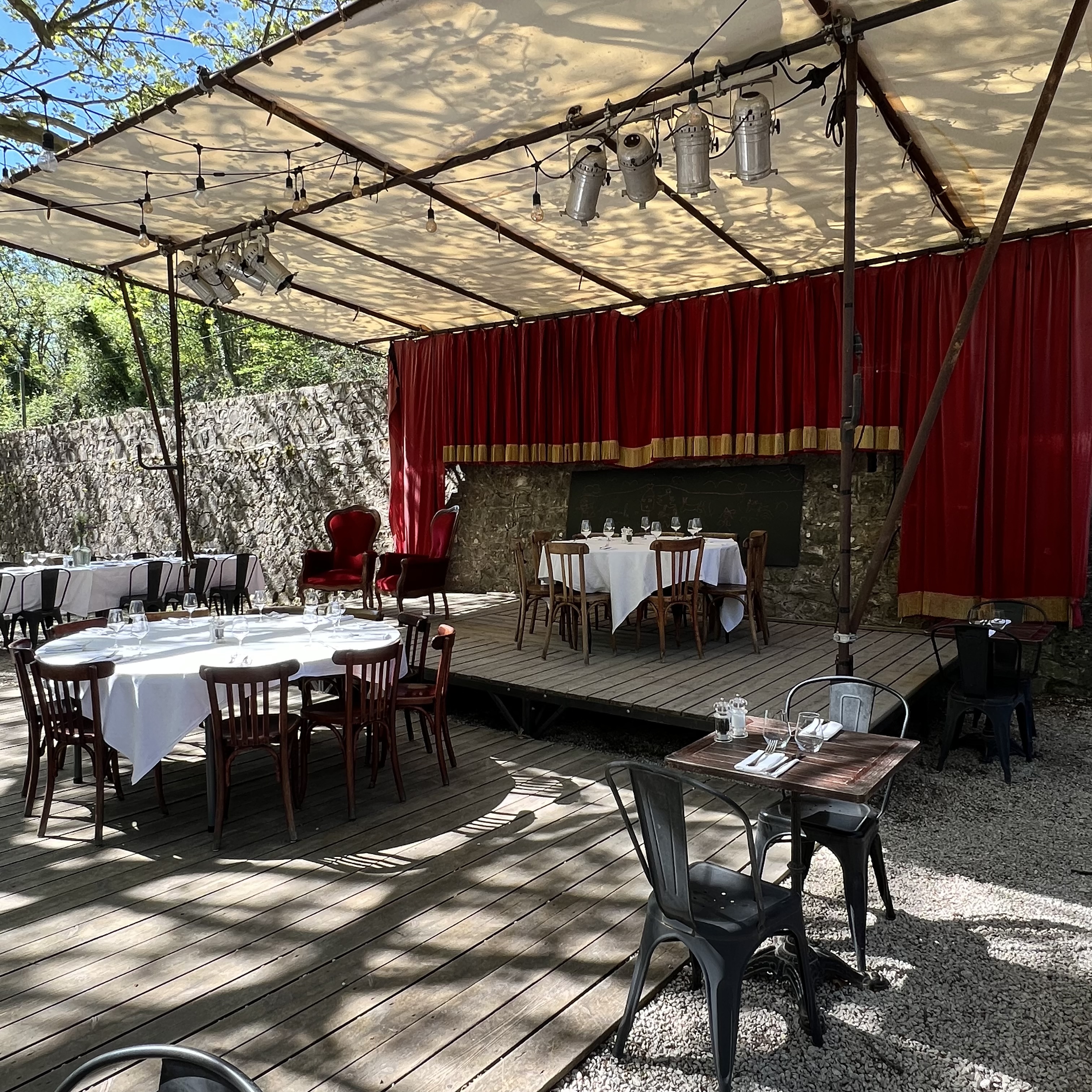 Endroit exceptionnel ! Dans un premier temps vous pourrez prendre un apéro autour du restaurant grâce au kiosque a proximité et ensuite vous délecter d’un bon menu bien préparé et agréablement présenté. De plus il y a plusieurs terrains de pétanque autour idéal pour finir l’après-midi. Le cours d’eau à côté avec un peu de chance sera accessible et du coup vous donner un cadre encore plus agréable pour votre journée de détente en Drôme provençale tout à côté du début du Vercors. La déco est vraiment original et laisse présager spectacles et autres animations pour les enfants et pour les grands. Le personnel ne m’ont pas l’inspiration pour vous toucher un commentaire humoristique. Le tarif est un peu élevé mais reste raisonnable au vu du cadre et de l’expérience laissé. Je recommande cet endroit en famille ou entre amis.