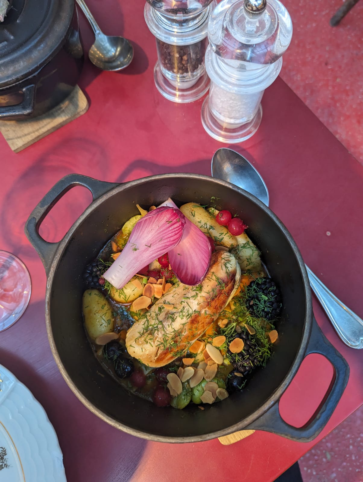 Nous avons bien mangé. Les plats sont servis en cocotte en fonte et font preuve d’originalité. Notation mitigée car le serveur qui s’occupait de nous s’est montré désagréable et complètement inflexible. Je ne m’attends pas à ce que le client soit roi, mais qu’il puisse arranger ou demander à son manager s’il n’a pas le pouvoir de décision lui même… au lieu de bouder notre table et laisser le relai à une autre serveuse (elle extrêmement sympathique). Les prix sont tout de même élevés pour ce qui est servi dans l’assiette, on paie aussi le cadre qui est très appréciable ceci dit. C’est bien d’y aller une fois ou deux pour profiter du cadre, mais il y a beaucoup d’autres établissements tout aussi bien à proximité qui n’ont pas encore « pris la grosse tête ».