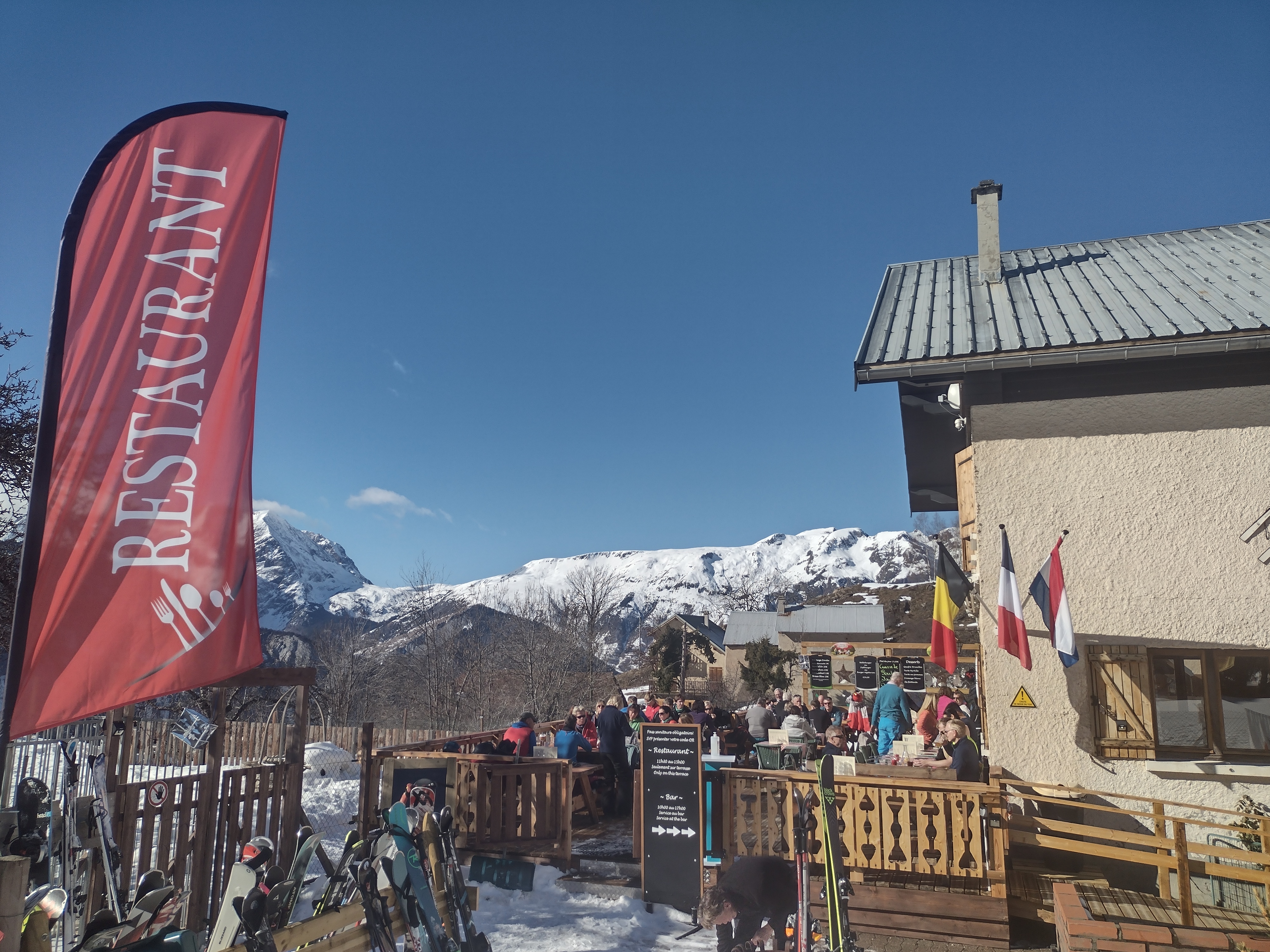 Accueil sympathique et chaleureux Belle terrasse au soleil au pied des pistes Carte variée avec plat du jour Plats de montagne classique Cuisine rustique et bonne Prix doux Meilleur rapport qualité prix du grand domaine de l’Alpe