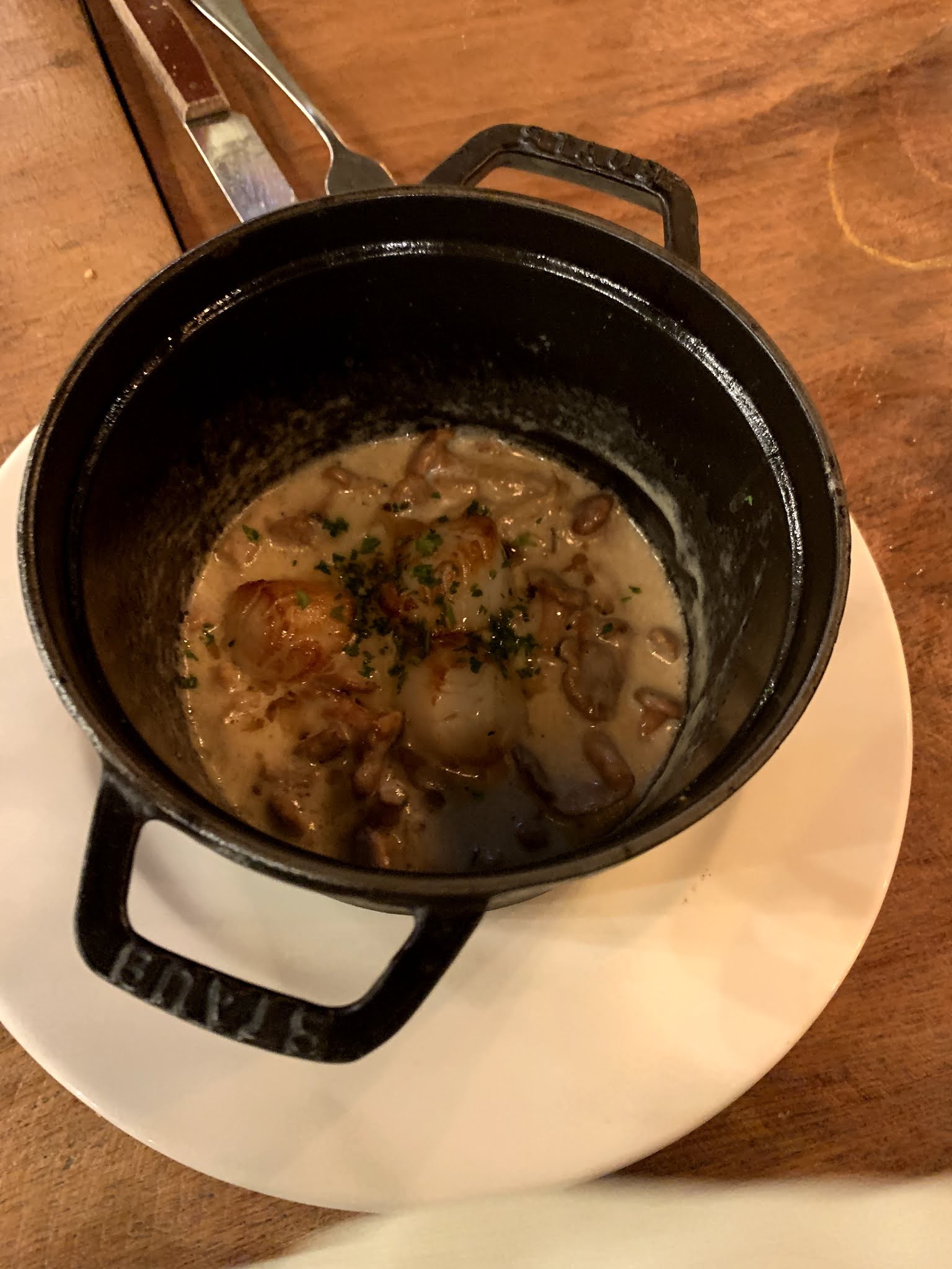 Parfait! Certainement pour les amateurs de viande mais 1 à 2 options végétariennes pour les entrées et les plats principaux. La nourriture était fraîche, savoureuse, bien équilibrée et bien présentée. Nos commandes (entrée, plat et dessert) sont toutes arrivées parfaitement à l'heure, ce qui pourrait être dû au fait que le lieu était à moitié vide, mais quand même, c'était génial de ne pas attendre 15-20 minutes entre chaque plat. Les portions sont assez grandes. La viande que j'avais (bœuf argentin) était vraiment savoureuse et accompagnée d'une sauce au fromage bleu, d'une sauce à la crème et d'oignons caramélisés (et de savoureuses frites bien cuites). Carte des vins très correcte. Des prix corrects pour la qualité de la nourriture. Les noix de Saint-Jacques aux champignons étaient incroyables. Le personnel était très attentionné et sympathique. L'atmosphère était relaxante avec de la musique jazz. L'intérieur est agréable et de bon goût avec de grosses pièces d'acier industrielles, des murs en briques, des sièges confortables en velours et de jolis éclairages muraux. Je suggérerais simplement de baisser l'intensité de la lumière (l'atténuer) pour une atmosphère encore plus chaleureuse. Super restaurant dans l'ensemble que je recommande, surtout si vous aimez la bonne viande à des prix assez abordables.