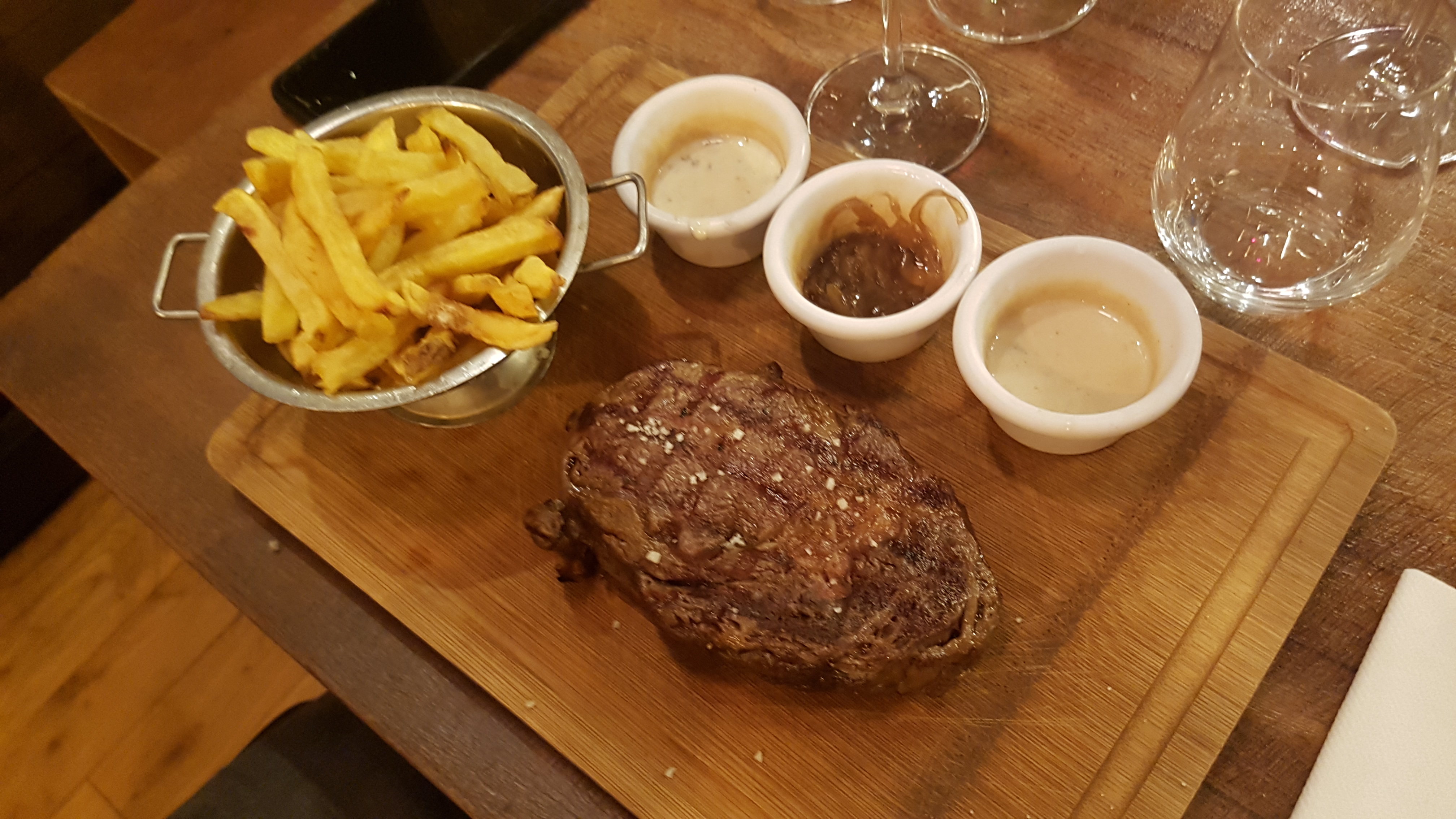 Très bon restaurant de viande, super rapide et agréable. Viande et sauces qui accompagnent, délicieuses ! Prix un peu élevé Une feuille de salade ou un petit ramequin de légumes grillés seraient les bienvenus en accompagnement de la viande et des frites