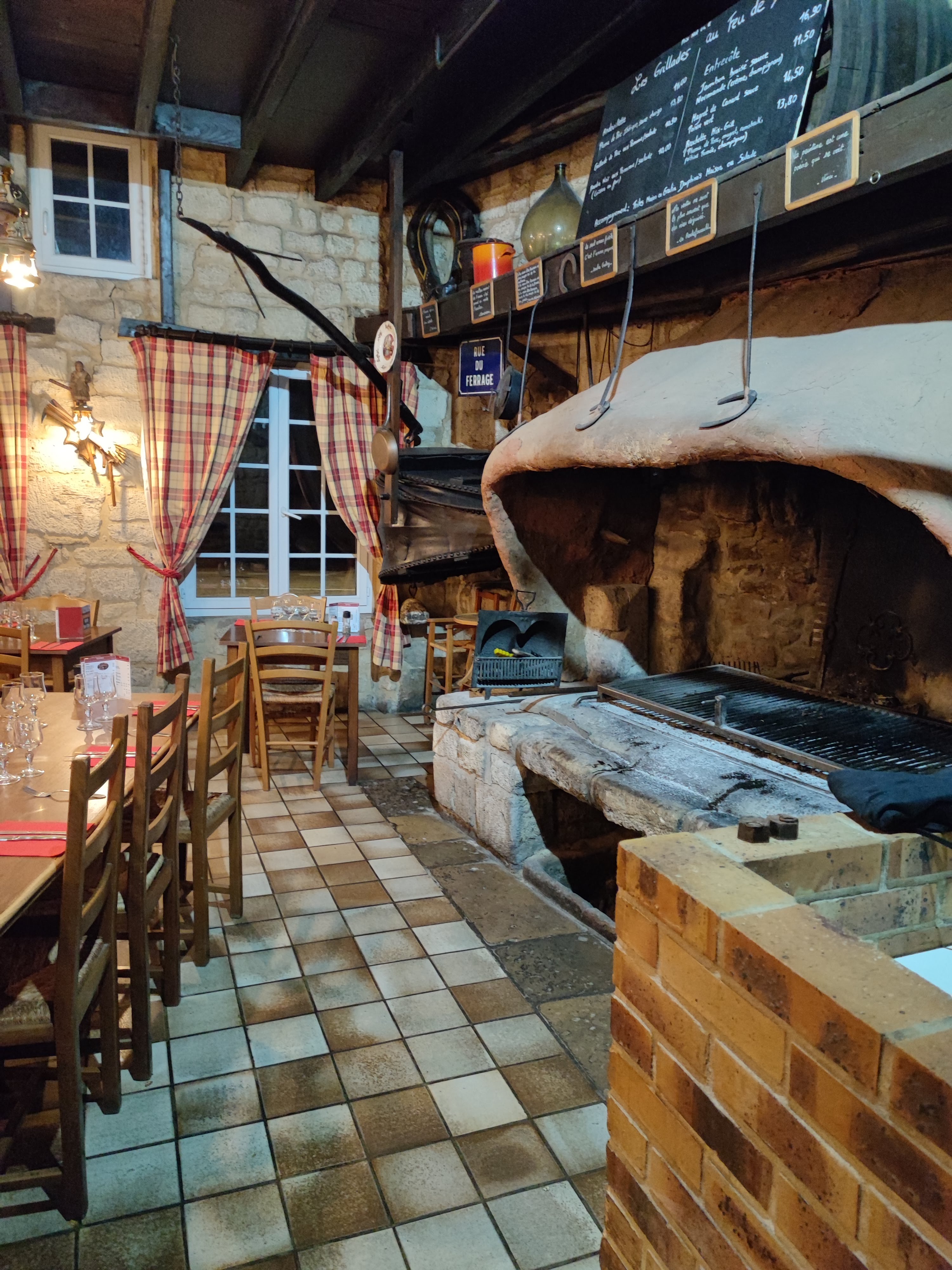 Contexte particulier covid19. Il est nécessaire de réserver. L'ambiance ancienne taverne est accueillante. L'immense cheminée encadrée par 2 soufflets de forge apporte un cachet certain et surtout sert à réaliser toutes sortes de grillades qui parfument la salle. Les prix sont abordables. J'ai trouvé le service un peu long.