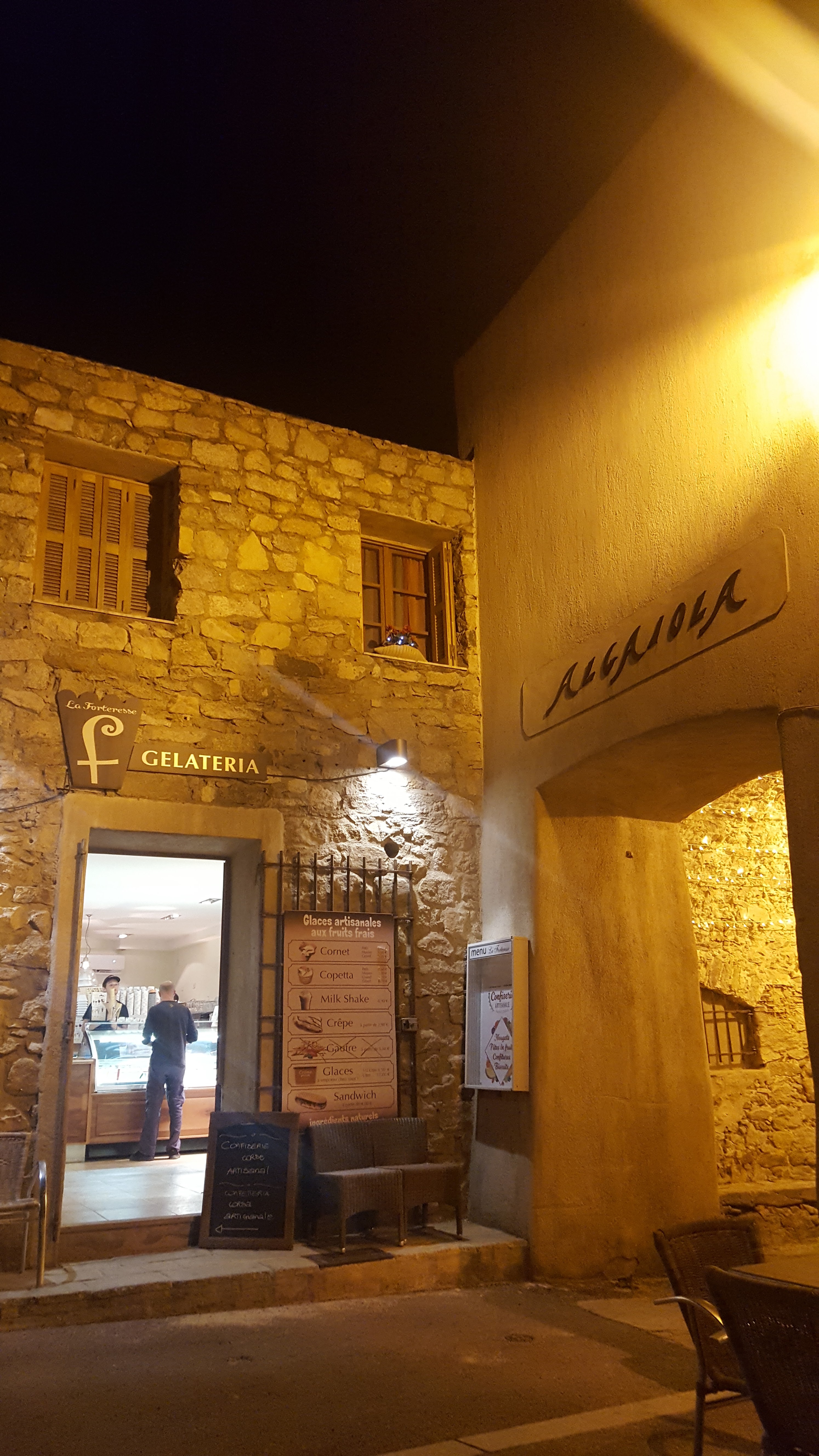 Artisan Glacier avec un large choix de parfums. Endroit très bien placé, terrasse à l'ombre des platanes. Il propose des crêpes, du paninis, des smoothies, des compositions de glaces et toutes sortes de boissons. Service de qualité, serveuse accueillante et très courtoise. Je recommande fortement, toute façon ce lieu est un incontournable d'Algajola. Vous n'y échapperez pas.