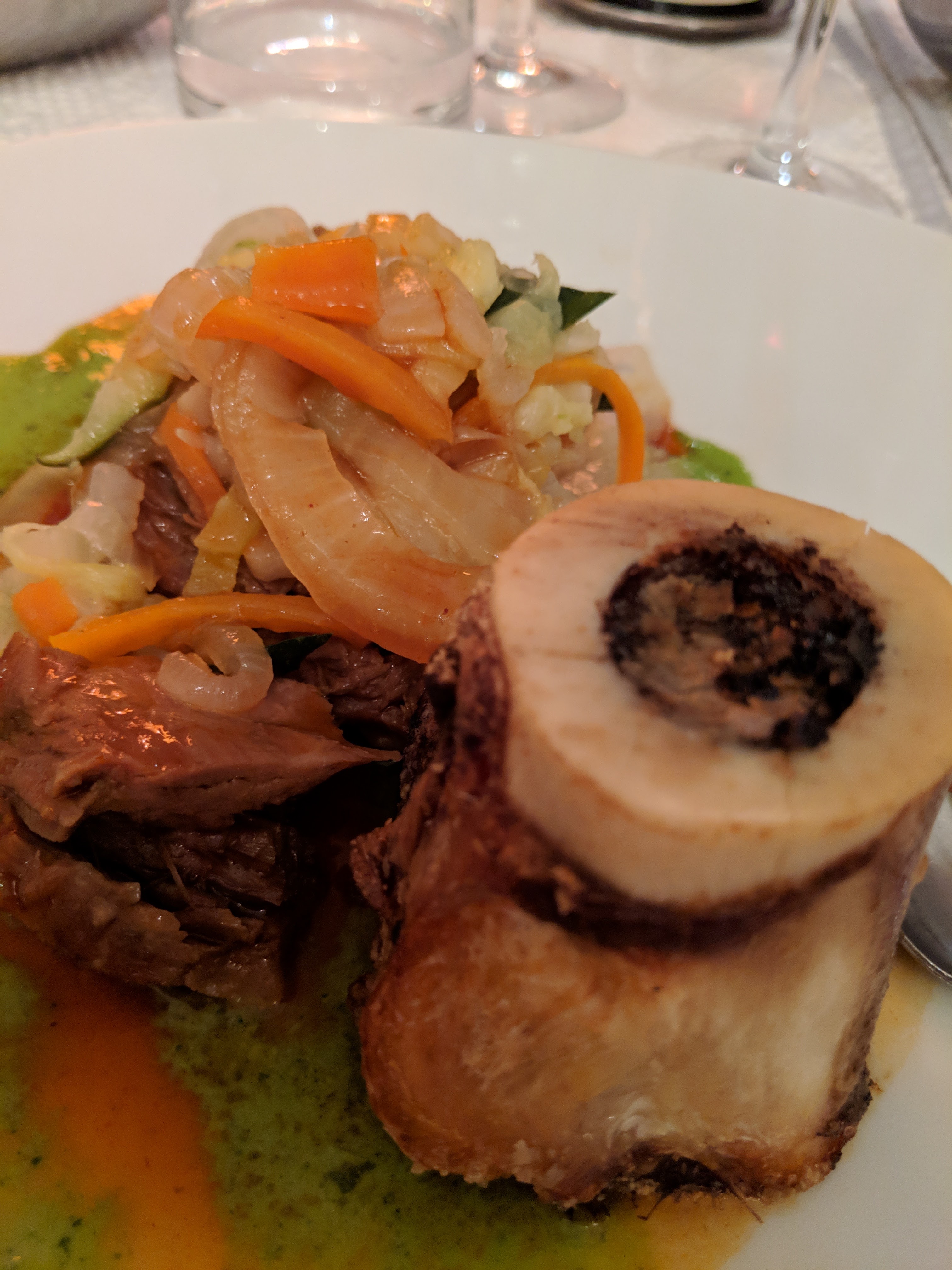 WOW tout simplement incroyable. J'ai eu le veau et ma femme a eu la morue, les deux étaient incroyables. Le service était parfait. Notre serveur parlait espagnol, anglais et italien. Conseil de pro ; faire une réservation. Salle comble un lundi.