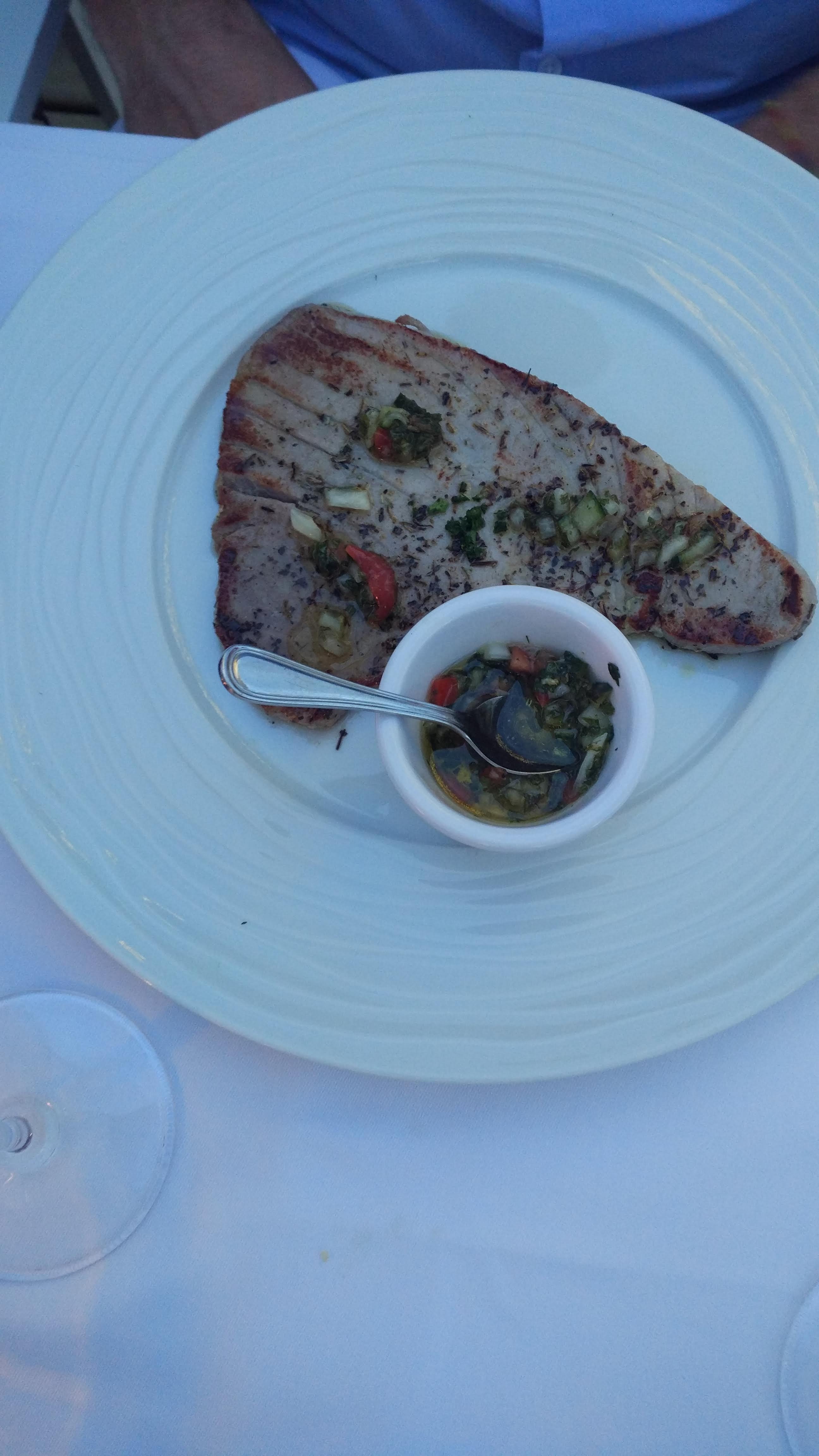 Une table pour deux, en plein soleil, face à la mer et aux bateaux, le paradis quoi ! Un bon poisson parfaitement cuit à partager avec un verre de blanc, Un personnel aux petits soins, Toutefois, ne venez pas trop nombreux pour qu'il nous reste encore de la place !