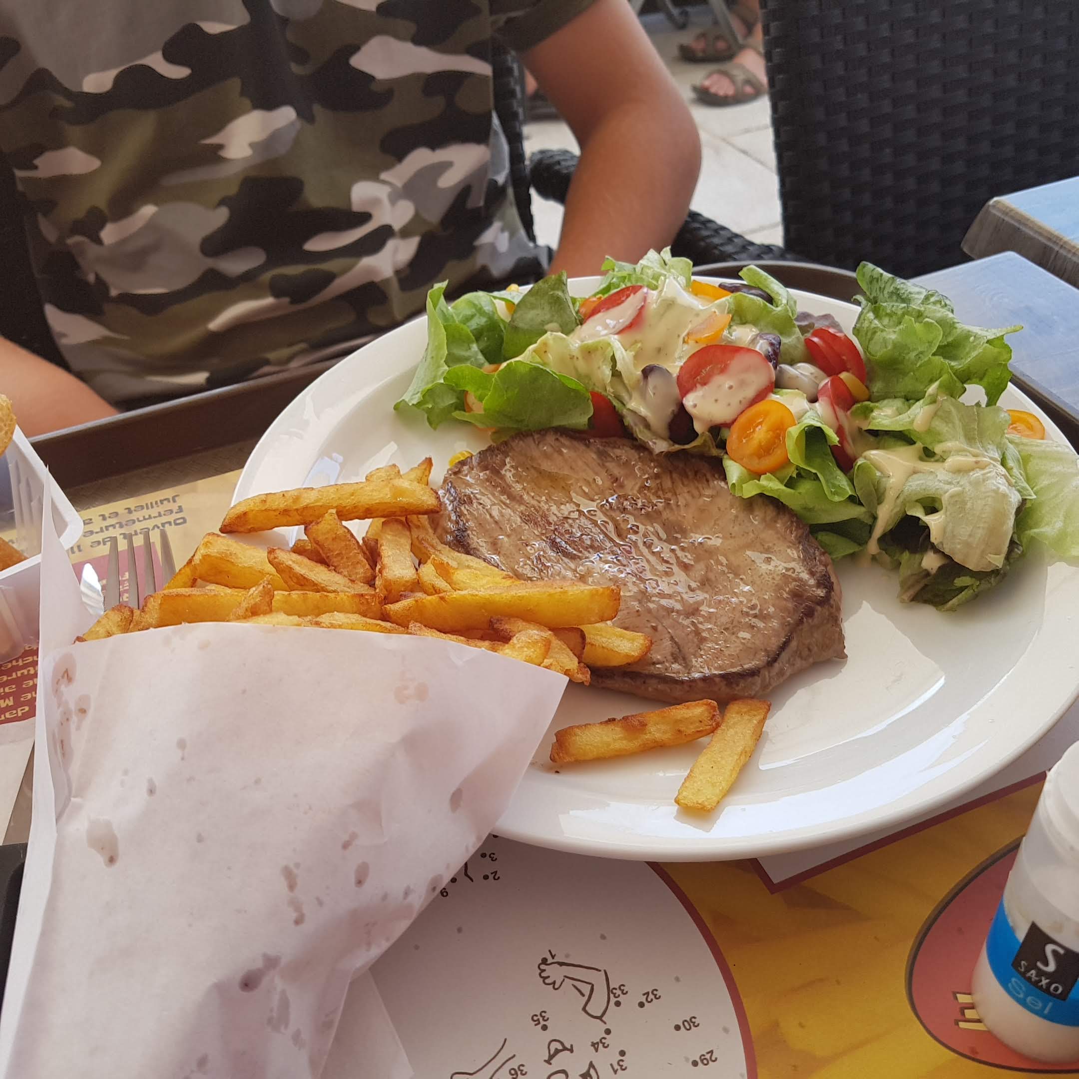 Repas agréable ..et le prix est raisonnable 10 EUR steak frites salades C'est mieux que d'aller Au mac Do Je recommande Les patrons et le salarié sont très agréables