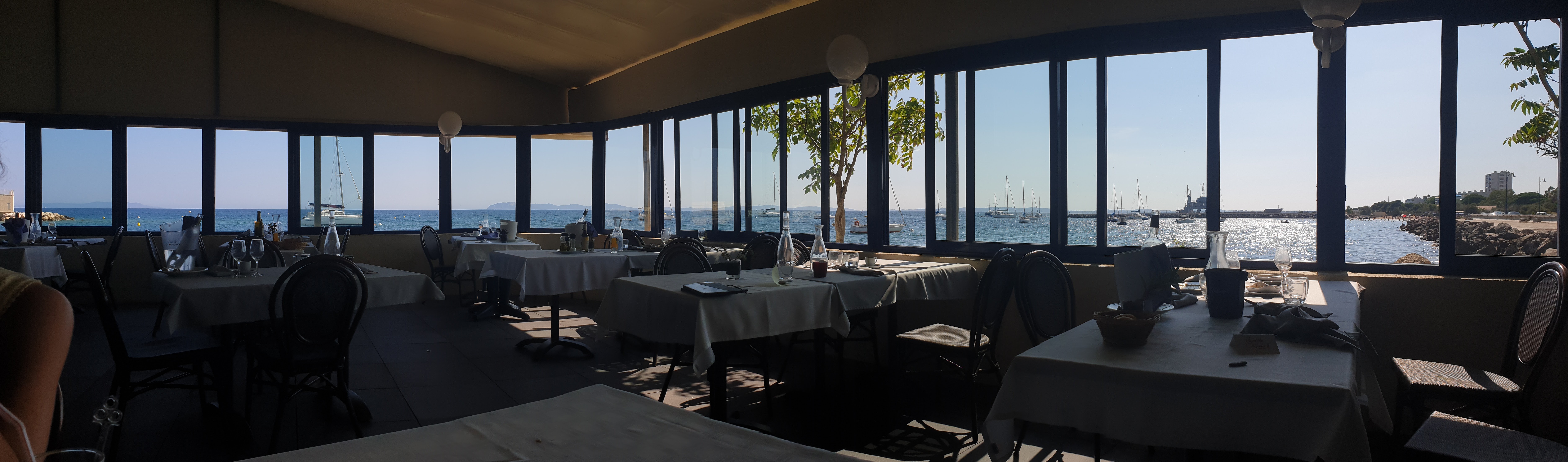Grande salle en bord de mer avec une vue remarquable sur les îles d'Or ; service professionnel ; bon accueil ; nous avons apprécié la bouillabaisse bien fournie en poissons (65 € par personne) ainsi que les vins locaux de Pierrfeu (30 € la bouteille). Nous avons passé un bon moment et nous reviendrons.
