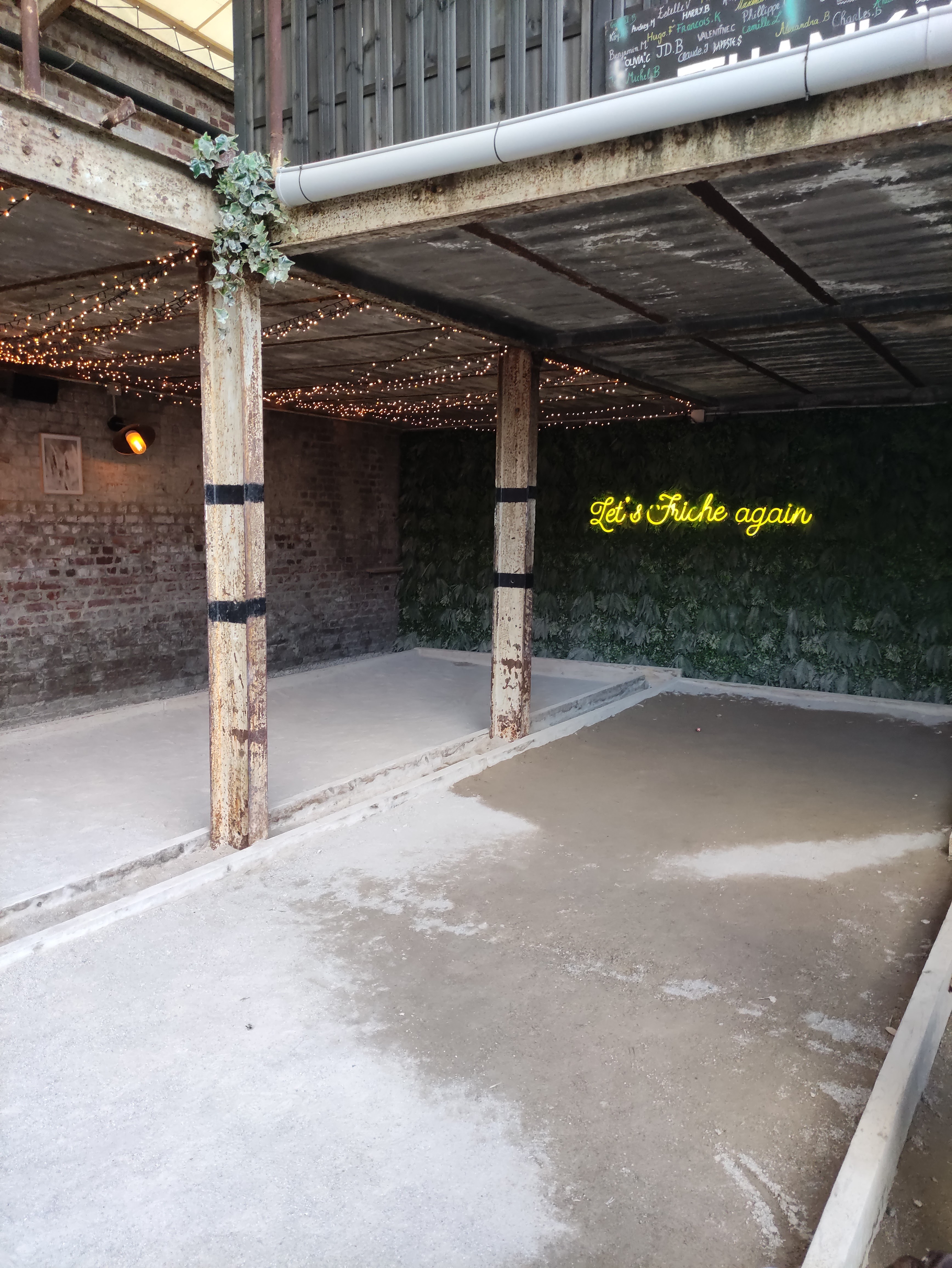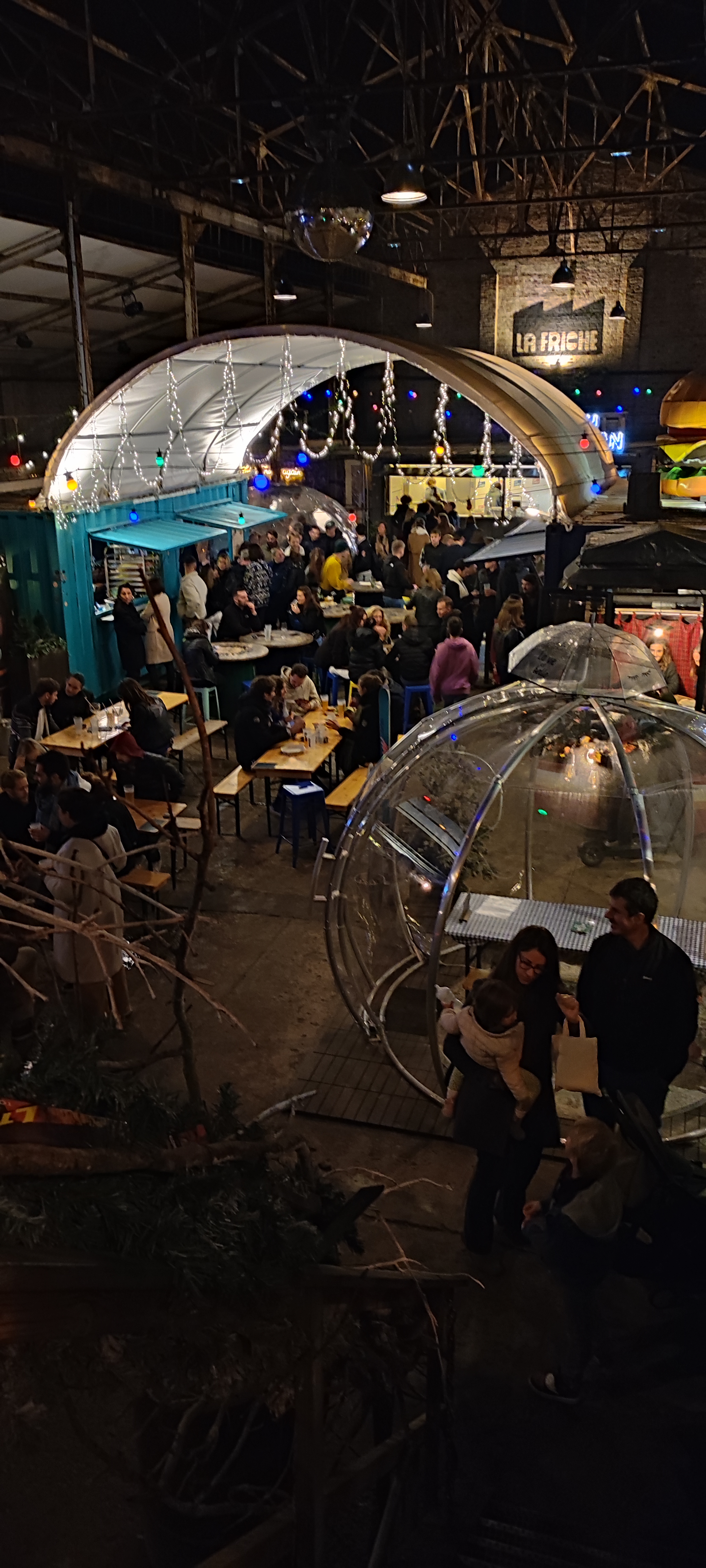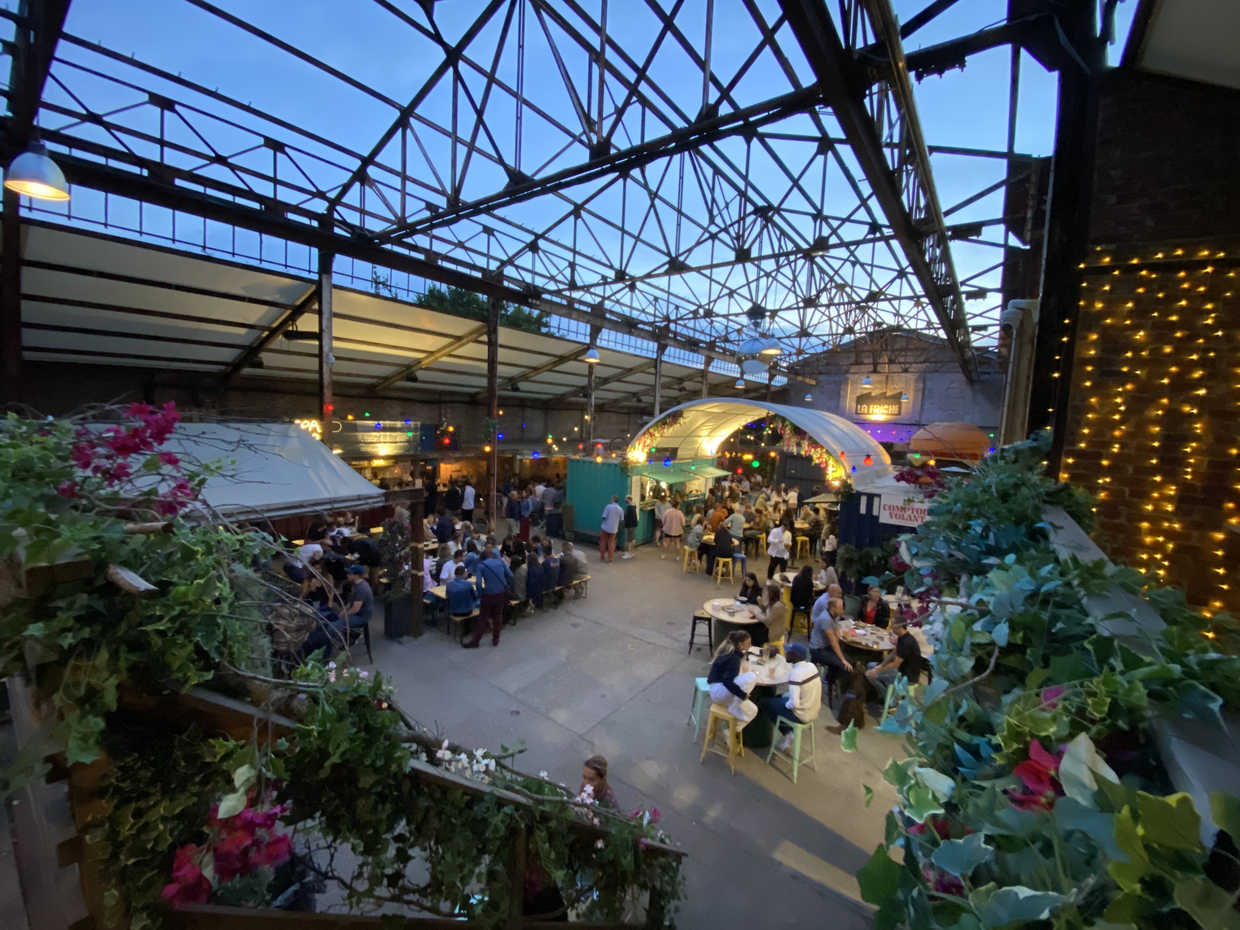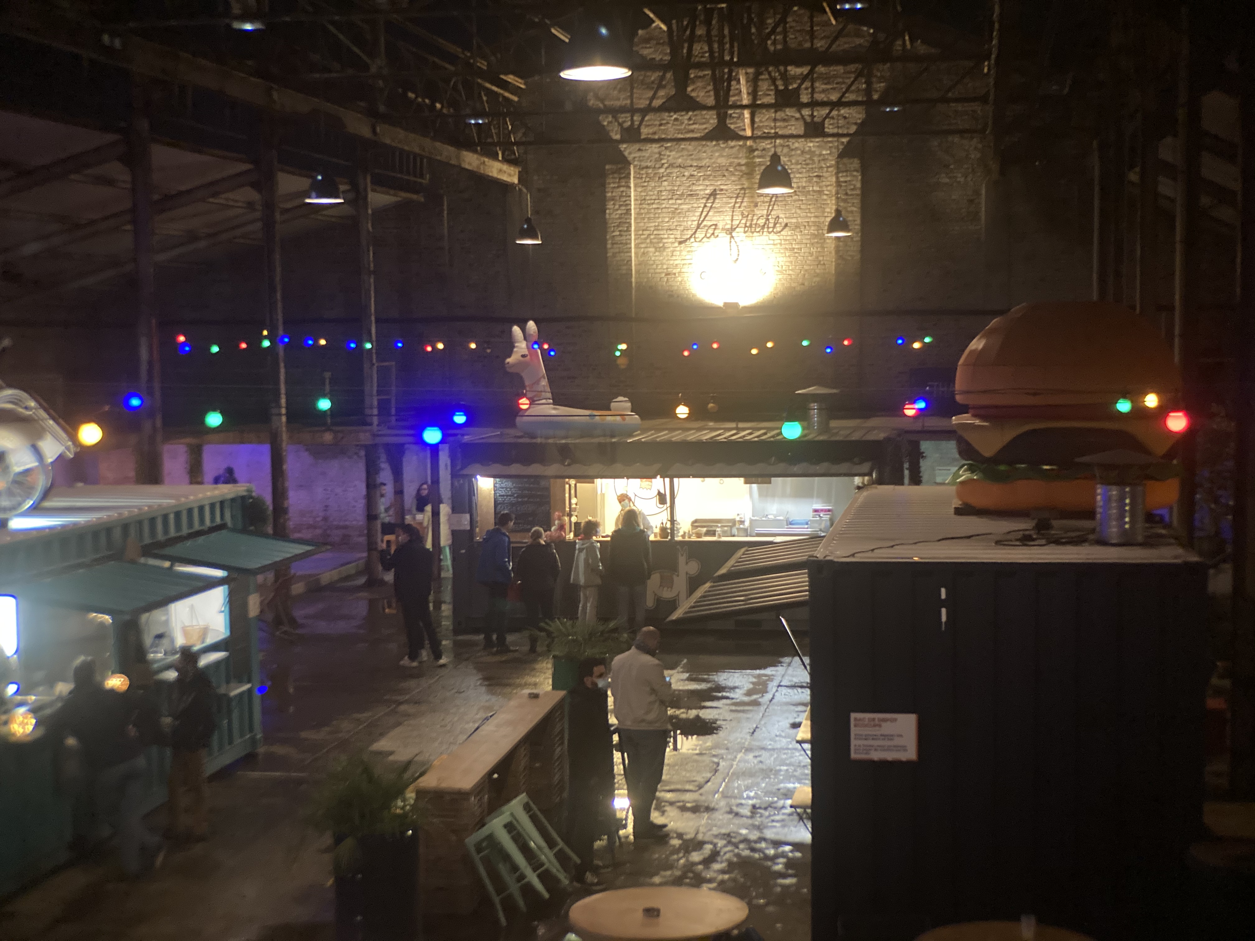 Très bruyant, nous avions réservé une table de 10 et nous tenions à peine dessus. Très décevant, friche ok mais de là à patauger dans la flotte pour se servir au bar ou aux foodtrucks non merci. Trop cher pour le concept. Plus jamais
