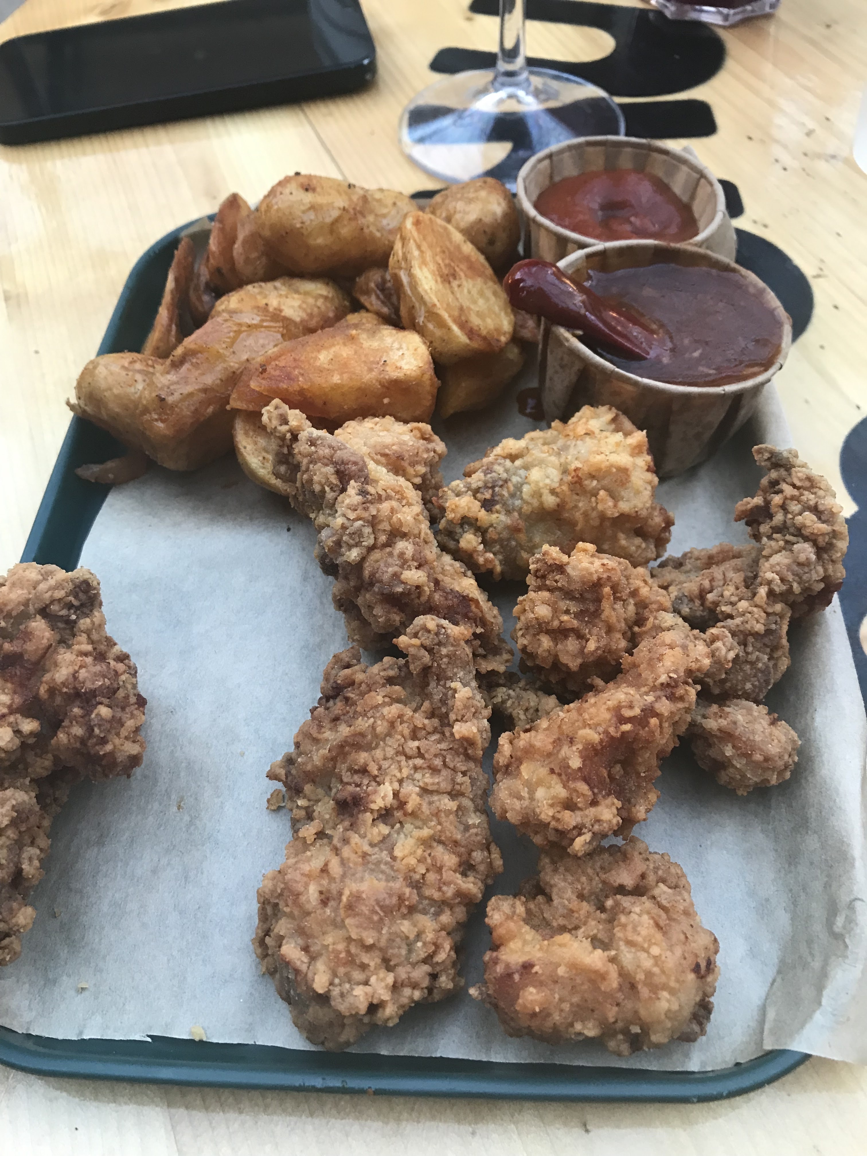 Sympa mais bruyant et table placée à côté du baby foot!!!. Food ok sauf Papa Rafele bon mais trop cher pour 2 parts 2 pizzas à 12€! Mieux pour les 10 chicken wings au même prix!