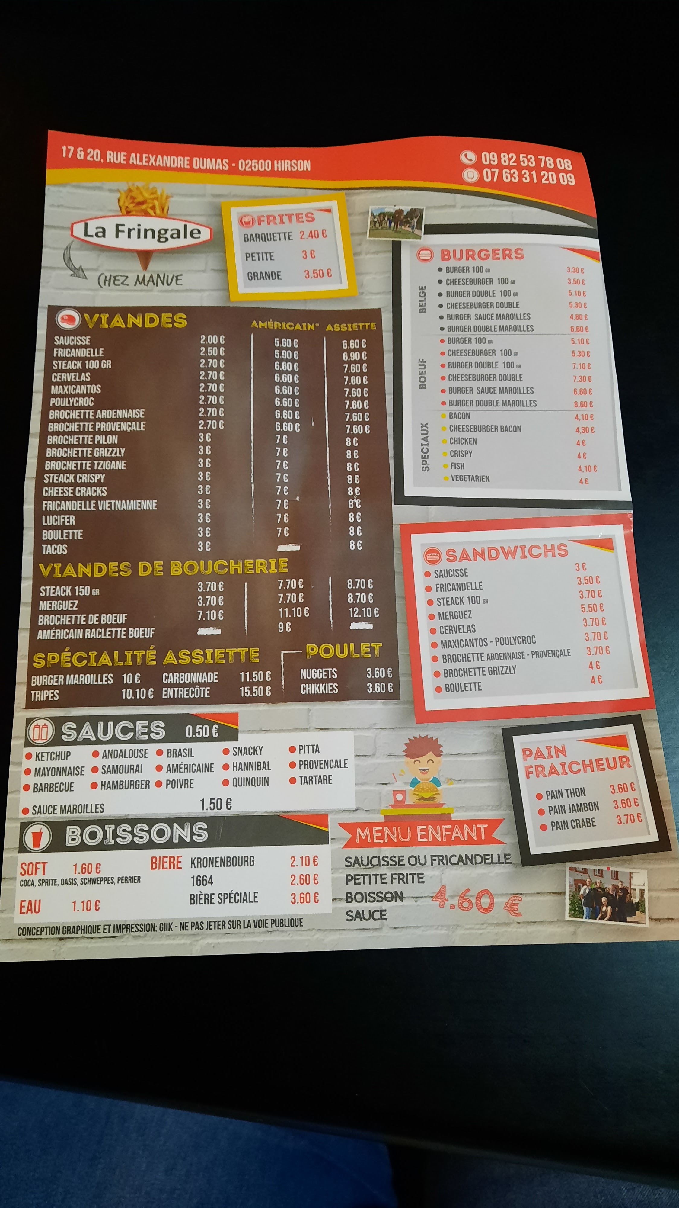 Avis moyen car pas d’explication sur les formules ni les produits proposés ni promouvoir leurs produits, la fricadelle on ne sait pas ce que sait. Des produits la plupart surgelés ou sous vide. Des boulettes je ne m’attendais pas a ce genre là. On ne sait pas ce que l’on mange. Tt est uniforme sans saveurs je dirais. Un peu viande reconstituée mais présente différemment. Des carottes râpées en sachets Des seaux de frites qui se ballades entre les 2 boutiques le personnel cuisine en civile les cheveux non attachés, hygiène moyenne. Comme a la maison. Des pots géants de sauce en tt genre. Vive la gastronomie française du Nord. Elle n’est pas mise en valeur. Vive la mal boufe. Les portions énormes de ce type de Nourriture pas pour moi. On aurait mieux mangé et moins chère dans un kebabs pour la même environ 6€ ou 7€ par personne. Personnel juste sympathique. Bien dommage. Même mes enfants ont pas aimés. Ils ont mangé que des frites avec maroilles. Pas touché aux sauces proposées ni crudités entassés. Je ne recommande pas ce lieu qui pourrait faire la fierté des gens du coin et du patrimoine culinaire des hauts de France .