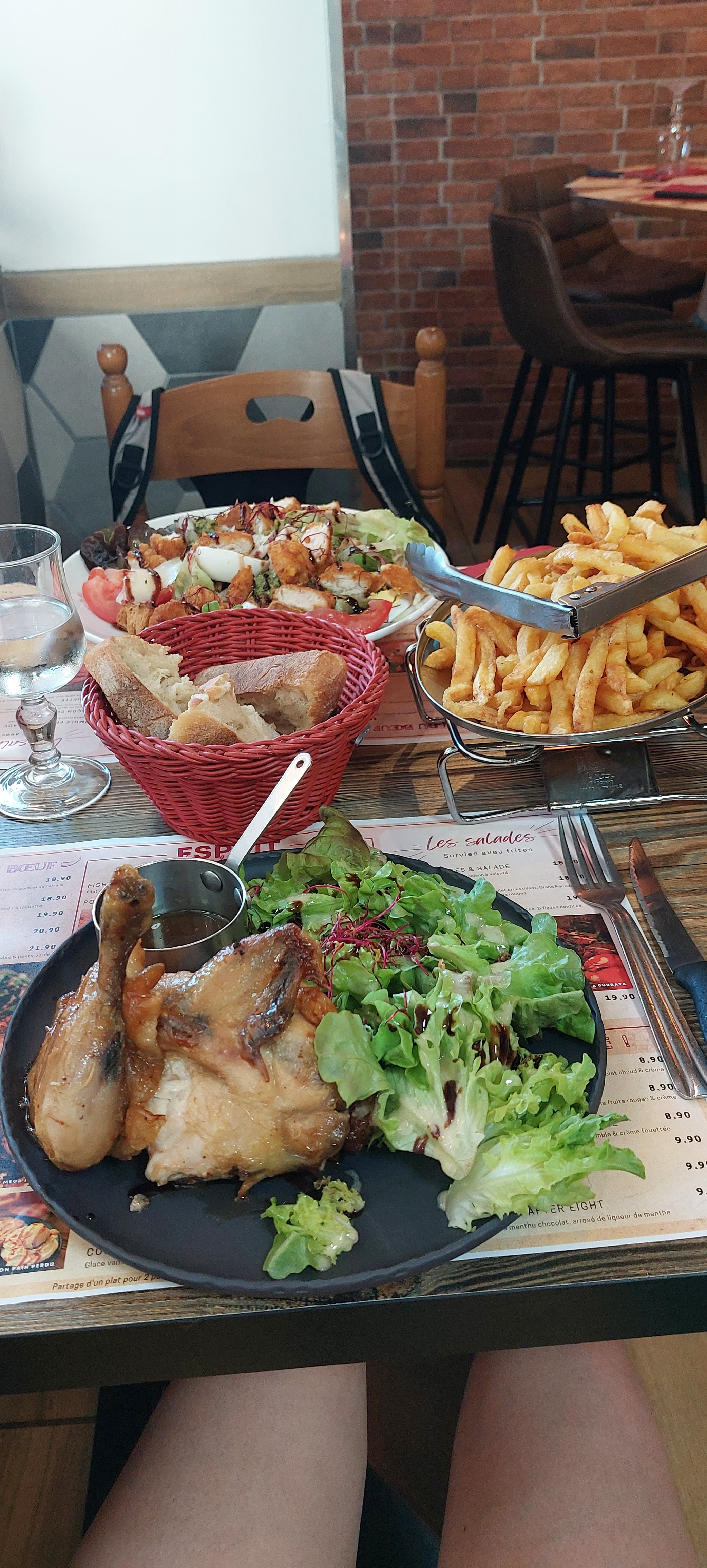 Je me suis rendue dans ce restaurant en famille car ma belle-mère adore ce lieu. Nous avons relativement bien mangé (un demi poulet pour ma part) et c'est très copieux ! Les frites, à mon humble avis, ne sont pas faites maison et sont servies sur un grand plat métallique posé sur un réchaud à la bougie ce qui évite qu'elles ne refroidissent. C'est très malin car précédemment (il y a 2 ans), elles étaient servies dans des saladiers et les frites refroidissaient beaucoup trop vite. Nous en avons tous déduits en sortant que le changement de direction a fait du bien à l'établissement car la qualité est remontée et le cadre du restaurant est beaucoup plus joli qu'avant ! les prix quand à eux sont relativement cohérents pour la quantité servie. Le prix des desserts tourne autour de dix euros ce qui est beaucoup trop pour la qualité de ceux-ci qui ne sont certainement pas faits maison. Pour les enfants, il y a un menu qui est franchement top (boisson, burger ou nuggets et dessert) et pas trop cher. Pour conclure : en cas de grosse faim, vous serez comblé !