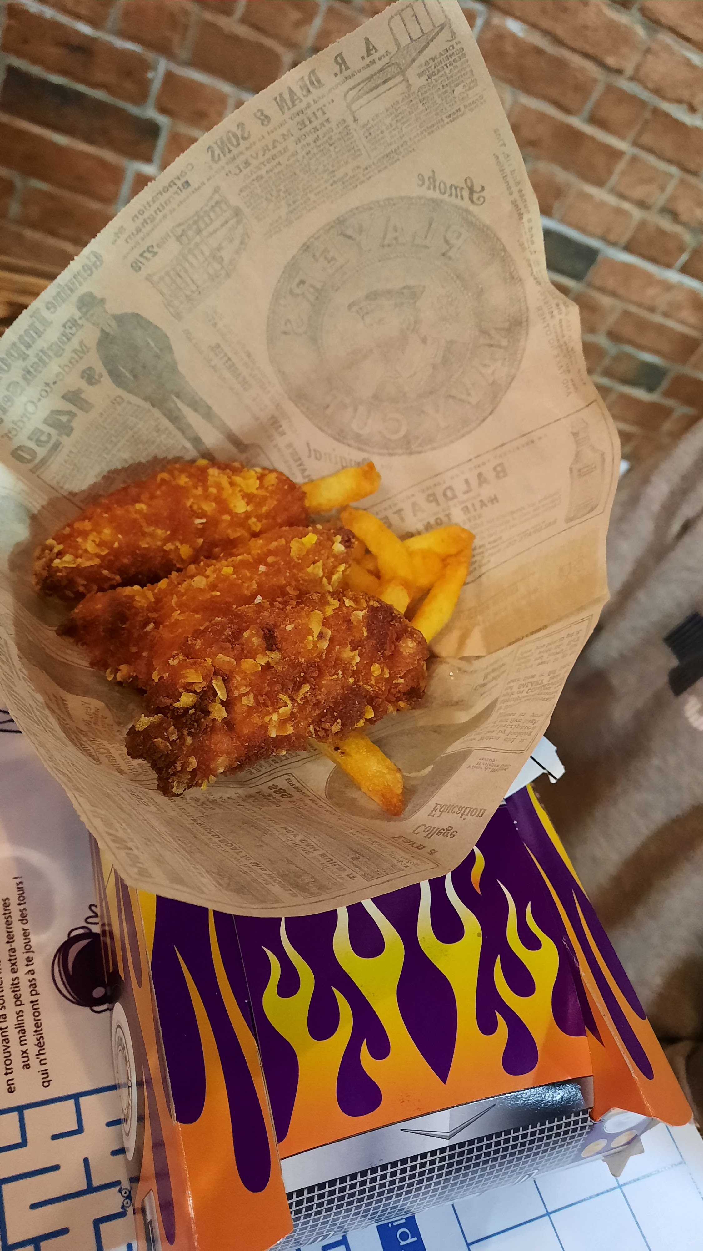 Déçue par le plat Les frites étaient très bonnes mais nous n avons pas aimé le poisson pané ( trop cuit) ni le poulet Service très bien ( la serveuse nous a propose de nous rapporter un autre plat mais c était la fin du repas nous n avons pas accepté)