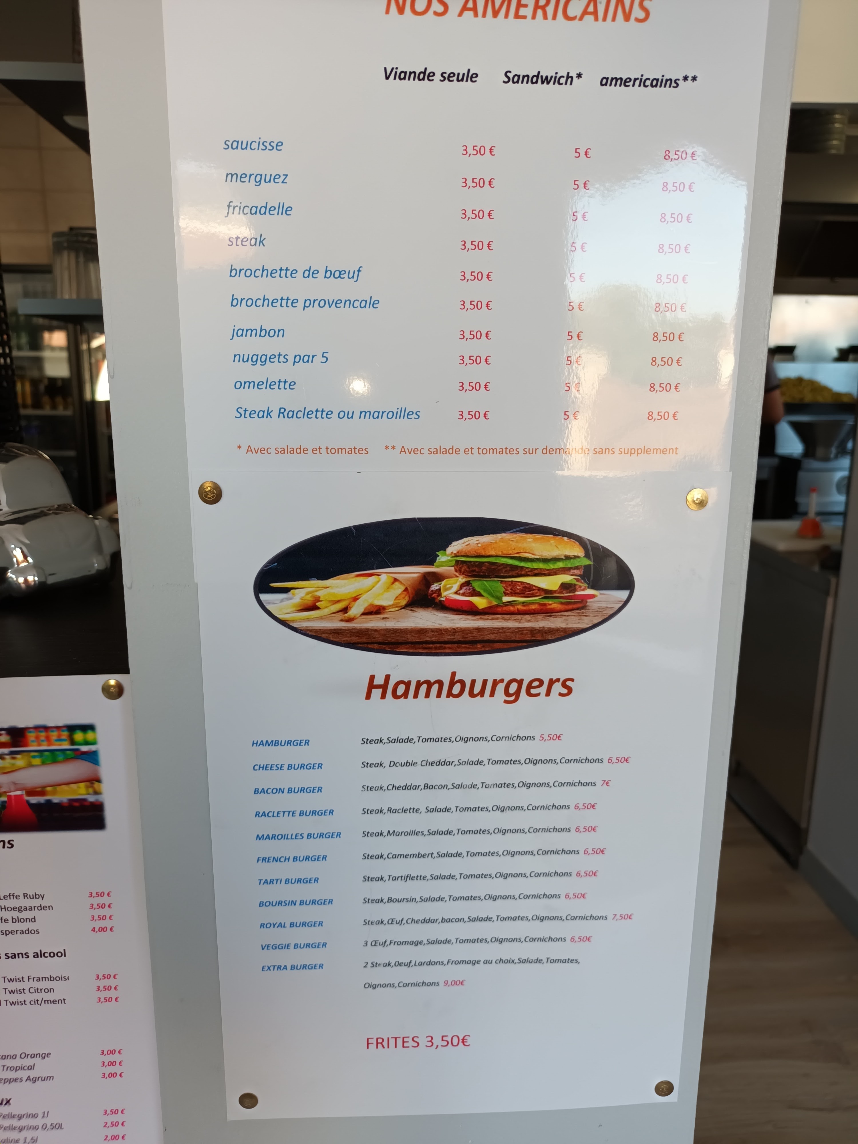 Étant nordistes, nous nous sommes arrêtés pour essayer ce restaurant et avons commandé à emporter car une fois entré, une odeur terrible de friture enveloppe toute la salle. C'est une friterie ok mais on est habitué de ce genre d'endroit et il y a clairement un soucis sûrement du à un manque de ventilation, un mauvais cloisonnement entre la salle et la cuisine ou des hottes pas assez performantes je ne sais pas. Nous avons preferé manger à la maison 😕 Honnêtement et en toute objectivité, nous ne nous sommes pas régalés, nous n'avons pas du tout retrouvé la qualité des friteries du nord, les frites étaient servis copieusement certe mais moyennement bonnes. Les hamburgers semblent bons, ma fille semble avoir apprécié mais les américains, menu préféré de tout nordiste sont très moyens. Je peux comprendre l'inflation qui nous touche tous, mais dans le nord un américain est servis actuellement pour 6€50 voir 7€ au maximum, copieux et avec beaucoup plus de frites, puis d'une qualité incomparable. 10.50€ un américain ici et pour une qualité plutôt moyenne, c'est beaucoup trop cher. Mais bon on à essayé. Enfin et surtout, ma compagne a été malade toute la nuit après avoir mangé son américain. Ok, un américain c'est lourd c'est peu être une indigestion mais ça ressemble pourtant à une bonne intoxication alimentaire car le lendemain matin elle est encore elle est couchée... Vous l'aurez compris , dans le doute et pour tout ce qui à été mentionné nous ne reviendrons pas. Réponse au propriétaire: Il vous est facile de dire que vous n'avez pas mon nom dans vos commandes, évidemment j'ai commandé sur place et pris à emporter! Depuis quand donne t on son nom quand on commande sur place ? Votre carte l'indique pourtant, américain mexicantos 10€50 (Photo jointe ... ). Une telle mauvaise foi corrobore les dires d'autres commentaires. Vous n'aimez pas la critique néanmoins il faut être irréprochable pour pouvoir répondre avec cette arrogance que ce soit sur mon commentaire ou celui des autres.