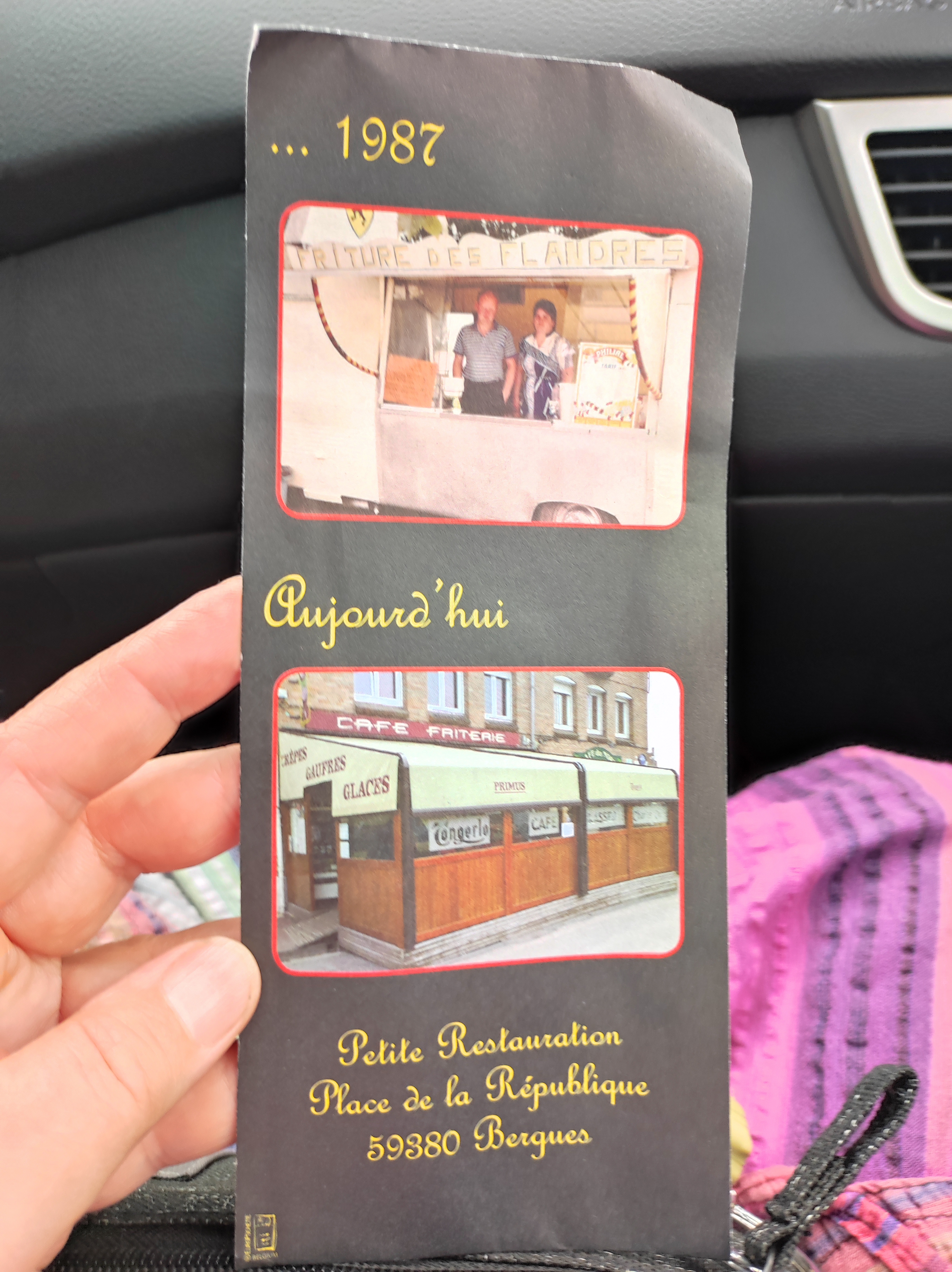 Un petit passage à bergues, très jolie. On a voulu couronner la journée avec cette friterie sur la place. Décevant, frites à l'huile de colza, et non à la graisse de bœuf, garniture light.