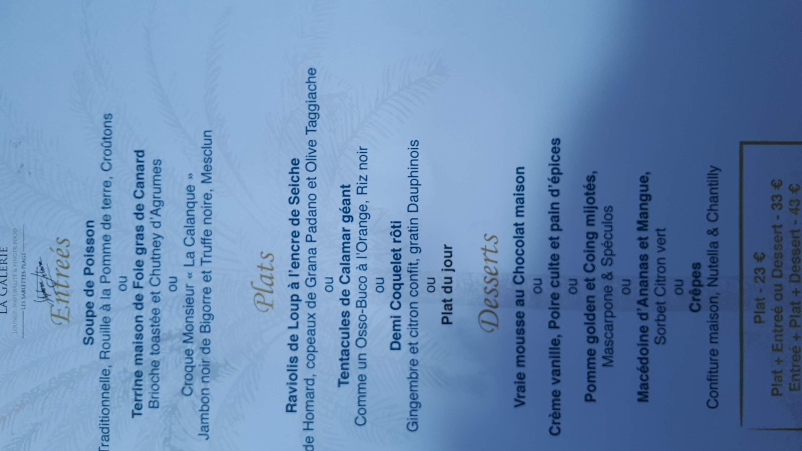 J'ai dîné à La galerie à l'occasion d'un séjour au Grand Hôtekd es Sablettes et tout était parfait . Le cadre est Top, la situation privilégiée face à la mer, le service de qualité et la cuisine au top. j'ai notamment beaucoup apprécié le plat du jour, de la Daurade avec un riz noir façon arrabiata, c'était une tuerie ! Merci à toute l'équipe !