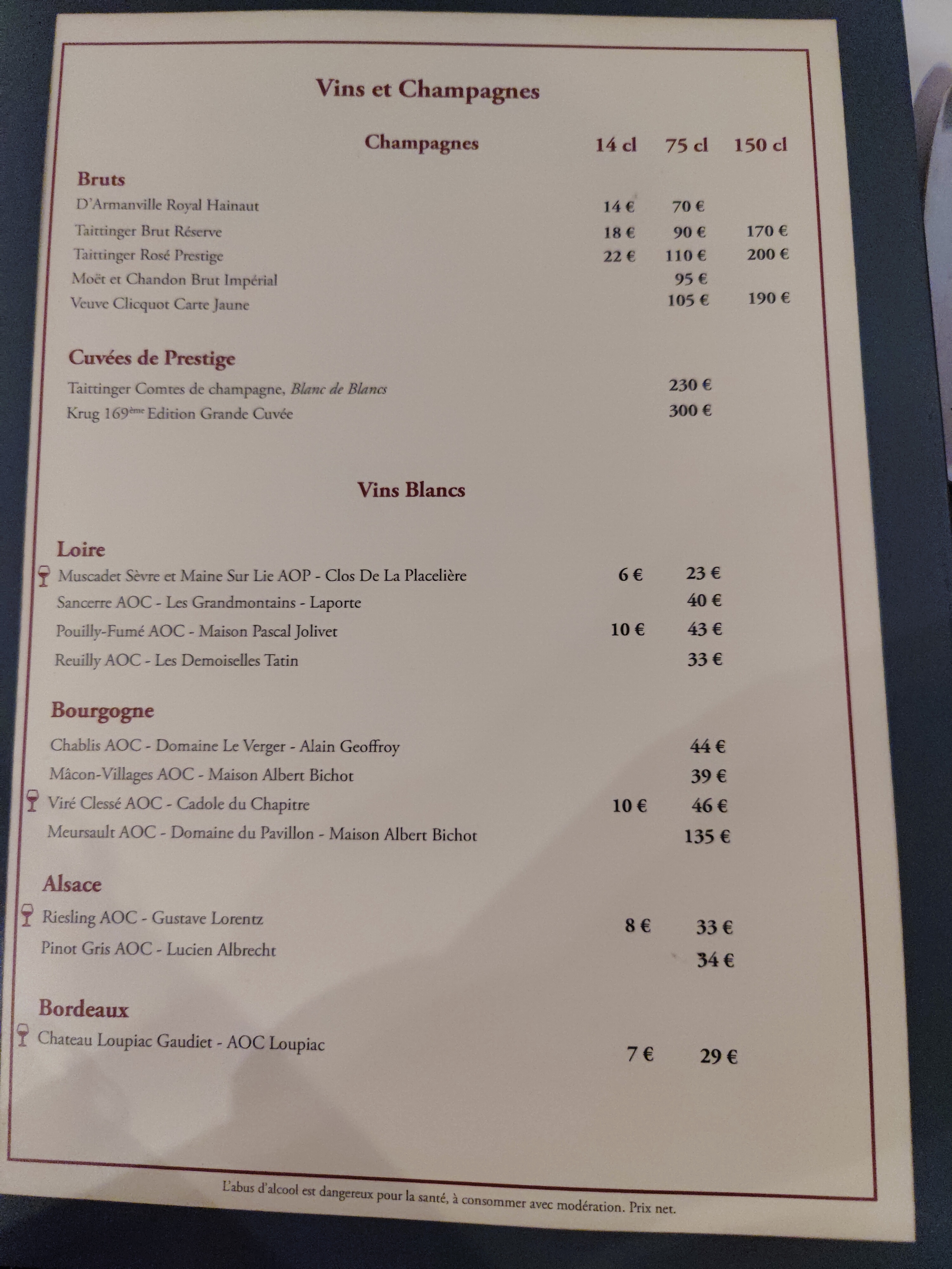 Parfait, avec un plat tout a fait simple et familial (bien de chez nous), c est un feu d artifice pour la vue, le gout et la quantité, pour un prix plus cher qu en brasserie mais vaut le supplement pour le decor, l ambiance et l enthousiame de tous les serveurs, accueil, un seul bemol un parking est prevu pour handicapés (tres peu de place, et a la rue, vous pouvez rentrer et rester dans la cour du royal hainaut mais 15 € quelque soit le temps donc environ 3 h = cher pour nos handicapés) Dommage de pénaliser : Un seul BEMOL: POUR LES HANDICAPES= indiqué parking pour handicapes : peu de places réservées pour eux et pas pres de l entrée, nous pouvons rentrée dans la cour de l entrée d hotel mais deposer l handicapé a l ascenseur réservé, le laisser seul et aller rechercher une place pour se garer (difficile) ou rester dans la cour moyennant 15 € quelques soit le temps écoulé = tres cher en plus d une petite sortie que s offre l handicapé, pourrait faire mieux, 1 % de la facture serait presque honnête envers nos personnes en difficultés motrices, deja 50 cts de plus par convive pour energie ect...qui est tres certainement deja répercutée dans les prix des plats etc.., désolé tout ne sera jamais parfait, mais en notre siècle pas beauvoup d efforts pour le handicap