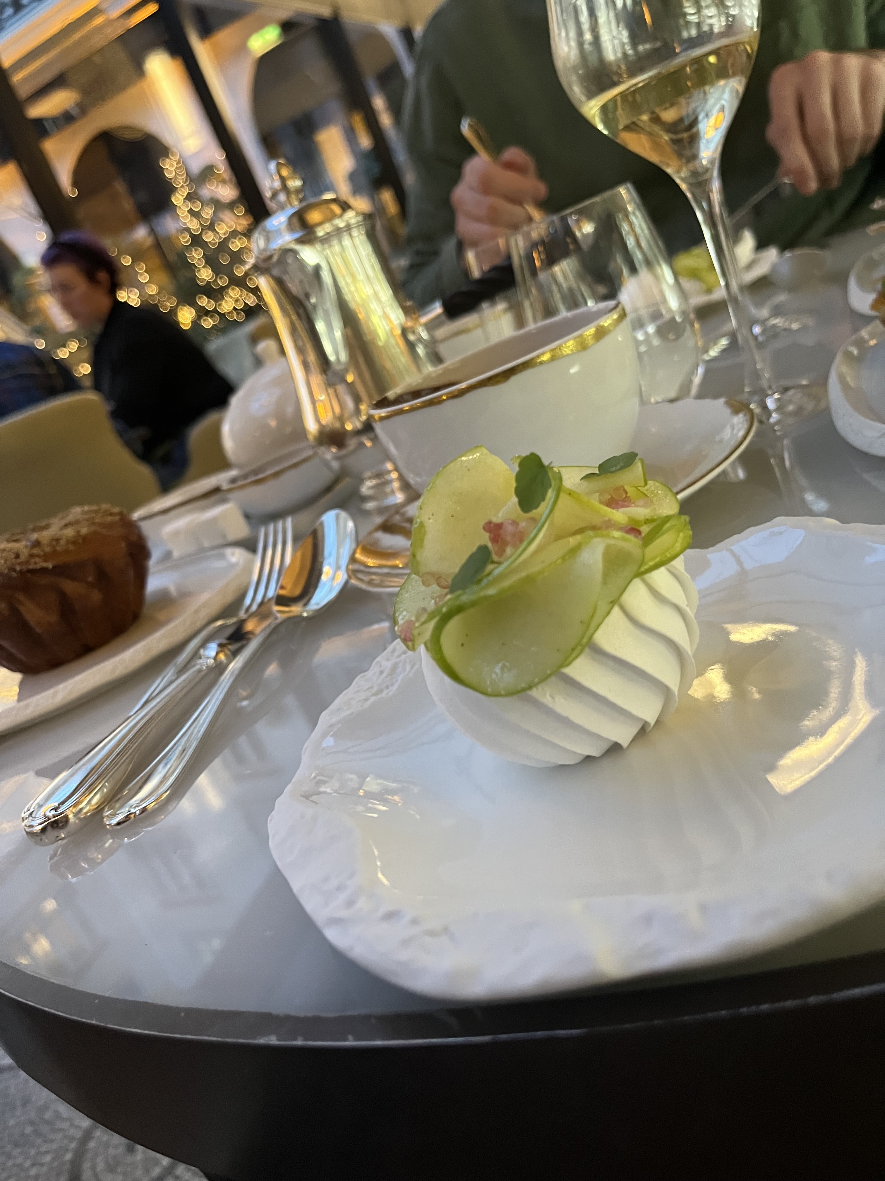 Service 5 étoiles, mais je dois donner 2 étoiles pour la nourriture. Nous sommes allés prendre le thé de l'après-midi après avoir vu tant de belles photos en ligne des années précédentes. Ce que nous avons eu n’était certainement pas ce que nous avions vu. À 75 $ par personne, j'ai d'abord été déçu par le thé lui-même - pas assez fort ni assez chaud. Ils ont apporté la nourriture une à la fois plutôt que dans les niveaux typiques que l'on voit lors des thés. Je ne peux que décrire la nourriture comme étant étrange et trop créative (et pas dans le bon sens). Nous n'en avons pas mangé la moitié. Il y avait un croquet de boules de tapioca, une sucette au foie de canard, une petite boule de sorbet imbibée d'eau de tomate, un petit rouleau de homard et un assortiment de pâtisseries aux saveurs étranges. Le point fort était la tarte aux figues, mais la mousse de sarrasin était un point faible. J'étais tellement excitée par ce thé et j'ai presque pleuré à quel point j'étais déçue. Le gérant a constaté que nous n'avions pas beaucoup mangé et nous a demandé notre avis. Je lui ai gentiment dit que ce n'était tout simplement pas ce à quoi je m'attendais et je lui ai montré les photos en ligne. Il nous a renvoyés chez nous avec des macarons et des quatre-quarts gratuits que j'ai trouvé charmants et très attentionnés. Réflexions finales... le cadre est magnifique et une expérience en soi, mais ne vous attendez pas à un thé traditionnel l'après-midi !