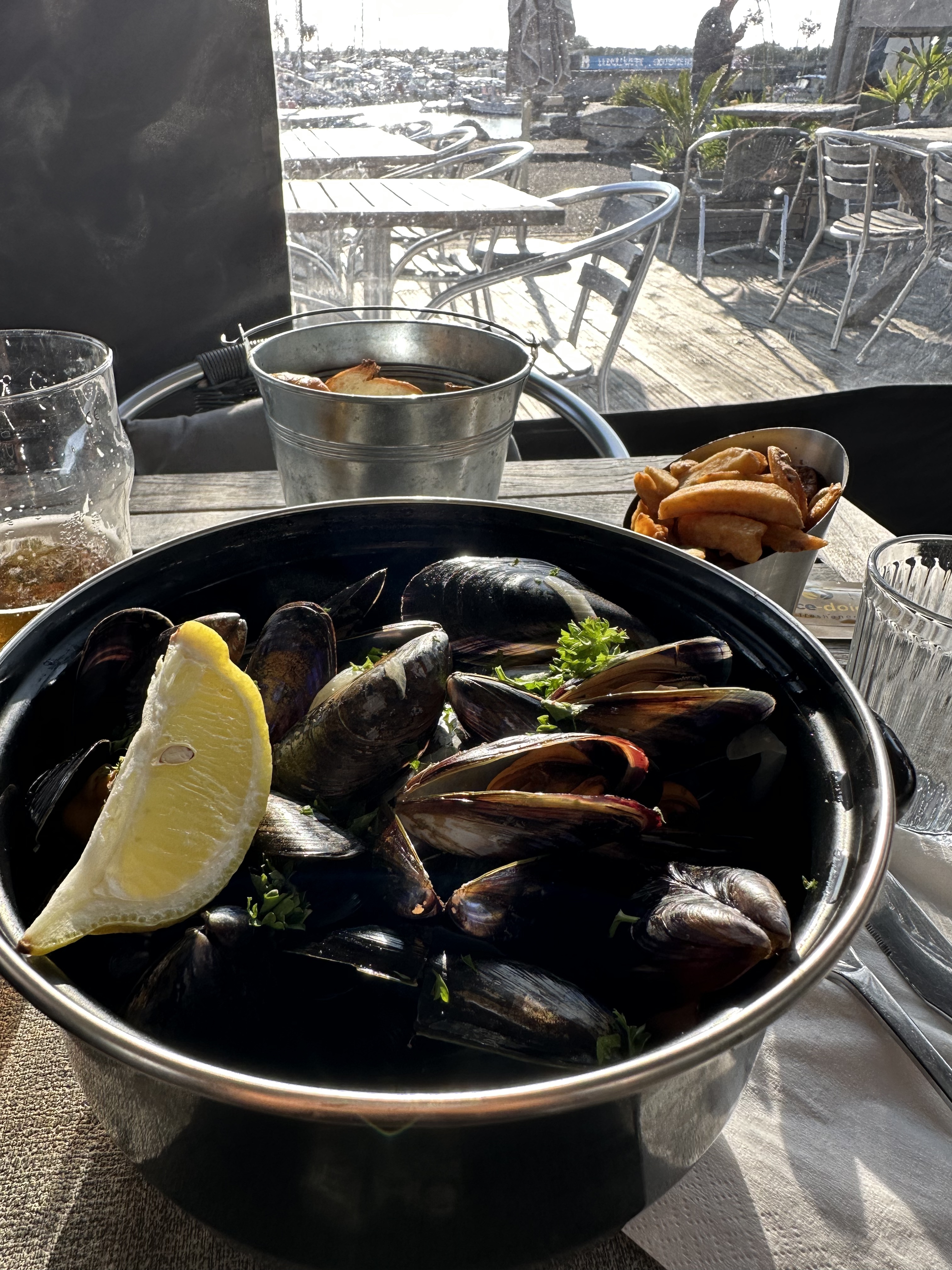 Pour manger dans le port, profiter du beau temps en terrasse abritée. Par contre les frites congelées c'est LA faute, on aimerait aussi qu'elle soient à volonté avec les moules ( plus pour le geste, en vrai les plats sont assez bien chargés)