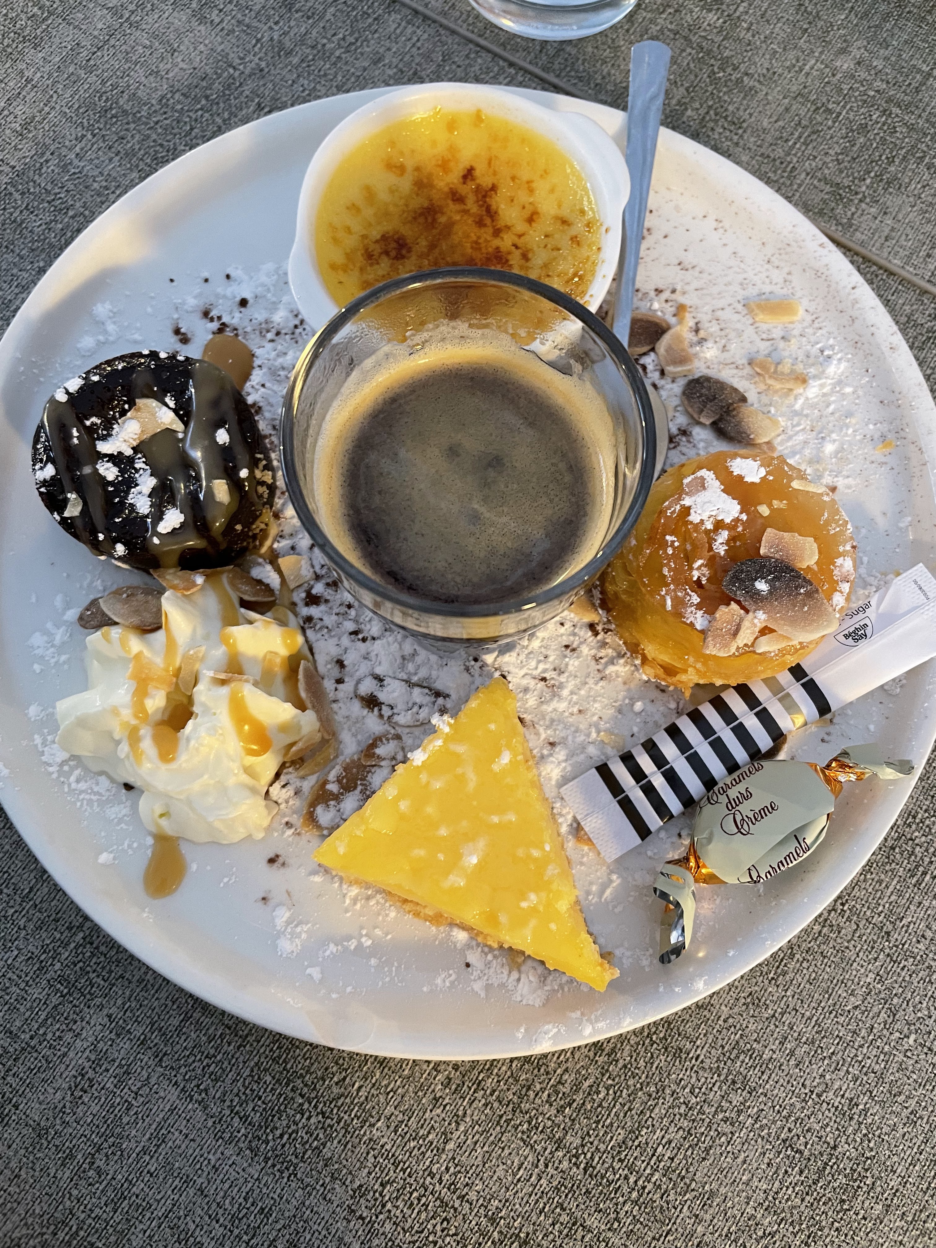 Cadre sympathique au bord du port. Plats convenables pour une brasserie. Présence de cheveux dans l’entrée et le plat qui gâche l’appétit!! Plats froid, quel dommage!! Néanmoins, le café gourmand était appréciable!!