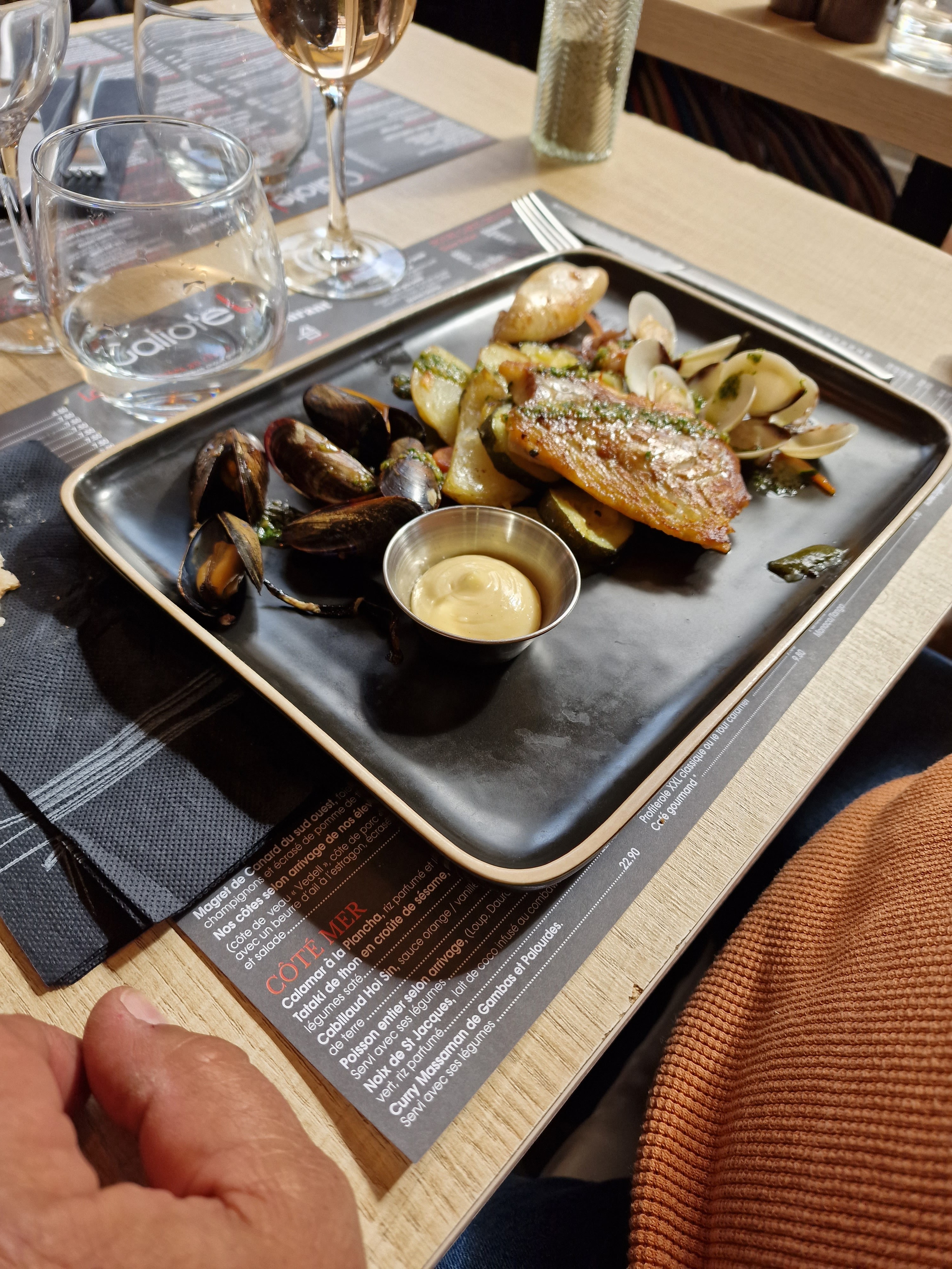 Très bon restaurant. Coquillage un poil trop cuit. Dessert extra.
