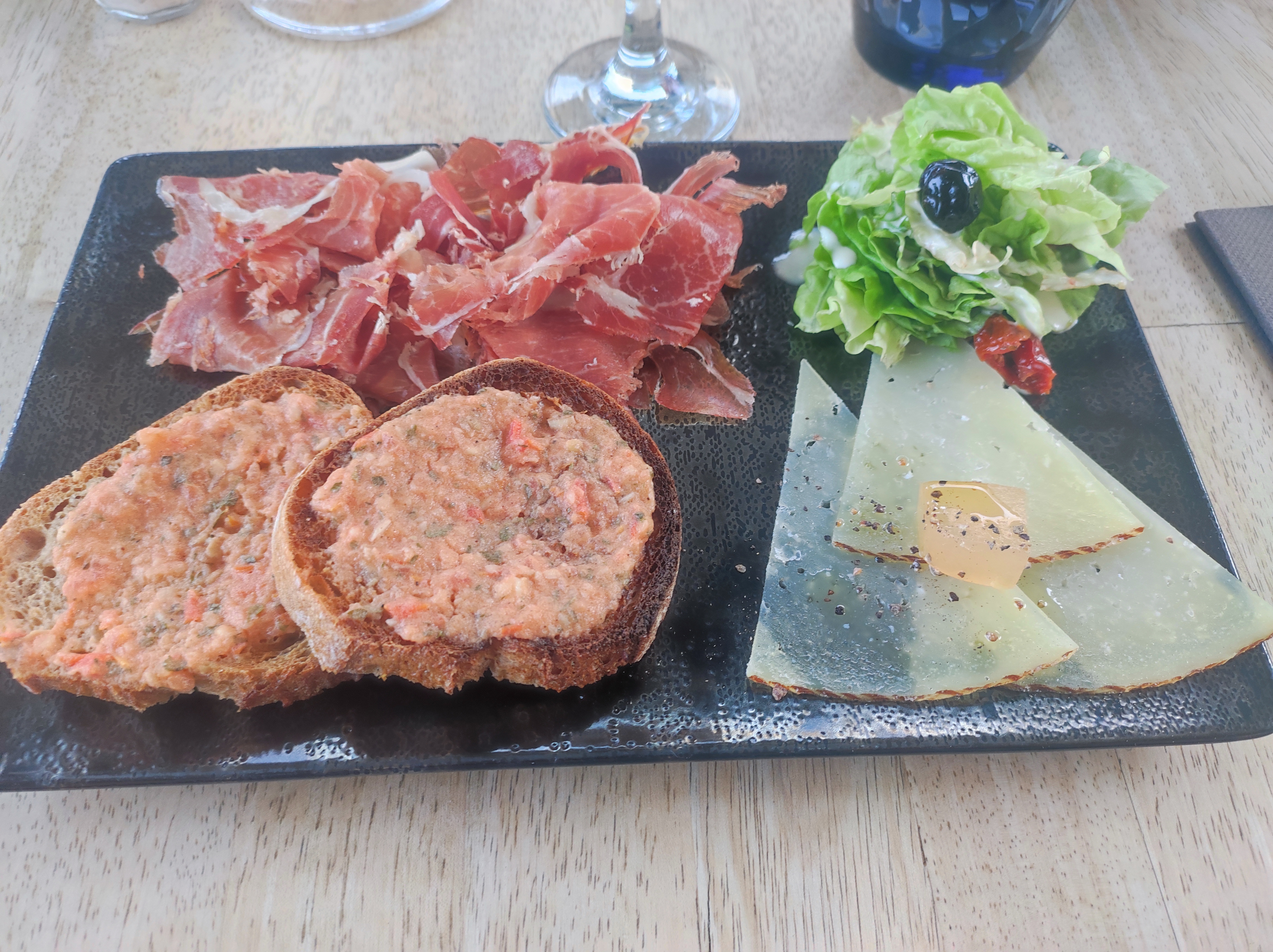 Excellent restaurant Menu à 18,90 € avec entrée plat et dessert c est rare, surtout que c est très raffiné, voir photos. Entrée serrano pan con tomate très bon et copieux avec pâte de coing, c est original. Encornets à la plancha, cuits comme à ma demande, et servi avec du riz basmati et sa sauce, les carrés de patates douces et une belle cuillère de polenta avec il me semble, une touche de vanille. Les desserts compris dans le menu sont variés et servi avec une belle cuillère en chocolat blanc. Je me suis régalée et je n ai pas pu finir mon dessert, car menu copieux. Les WC sont très propres et larges. La terrasse, malgré qu elle donne sur la route, est très agréable et aérée par temps chaud. Personnel très agréables, souriants et causants. La seule chose qu on pourrait dire, c est sûr la devanture du restaurant qui est abîmée. Mais je pense que ce n est que momentané. Je conseille vivement ce restaurant pour son prix, les plats raffinés tant en goût qu en présentation et pour son personnel souriant et agréable