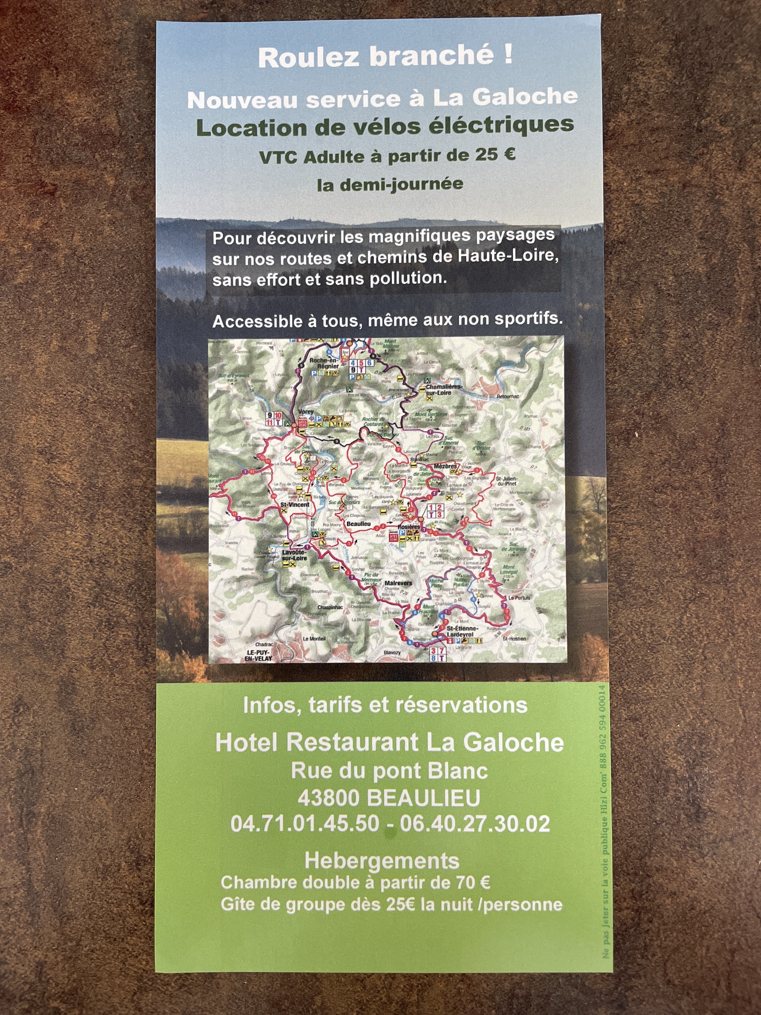 J'ai loué un vélo électrique à la Galoche. J'ai eu affaire à des personnes charmantes et serviables. Le restaurant la Galoche est très bien situé pour prendre des pistes cyclables, en particulier celle de l'ancienne voie de chemin de fer éponyme