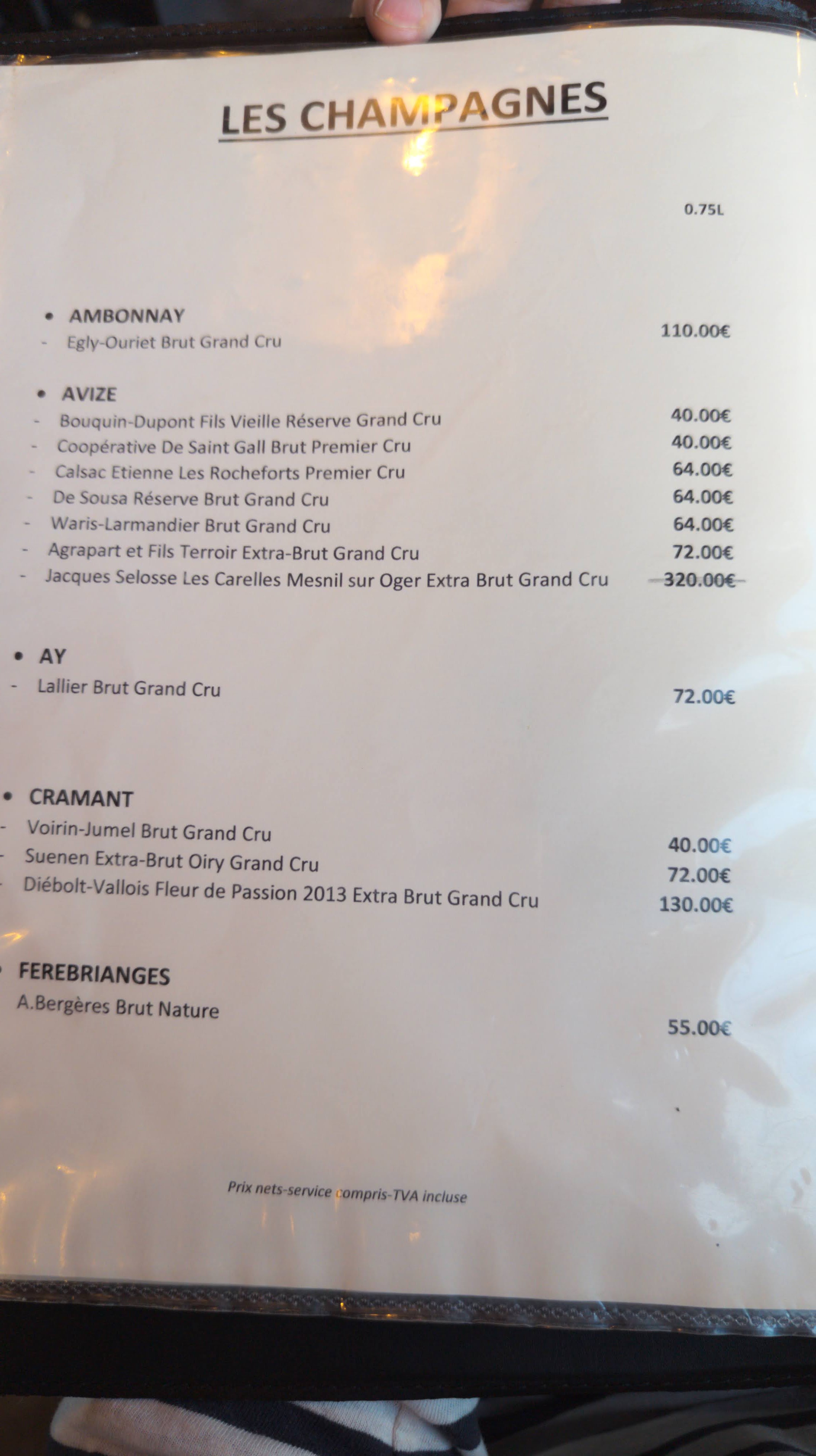 Pour les petits budgets, la maison propose une carte agréablement petite et accentuée pour tous les goûts. Soit à la carte, soit au menu 3 plats pour moins de 30 EUR. Nous avons été très satisfaits, la carte des boissons contient tous les vignerons de champagne réputés du Mesnil. Il y a aussi deux champagnes ouverts prêts. Le restaurant est également ouvert le midi et est quasiment sans obstacle.