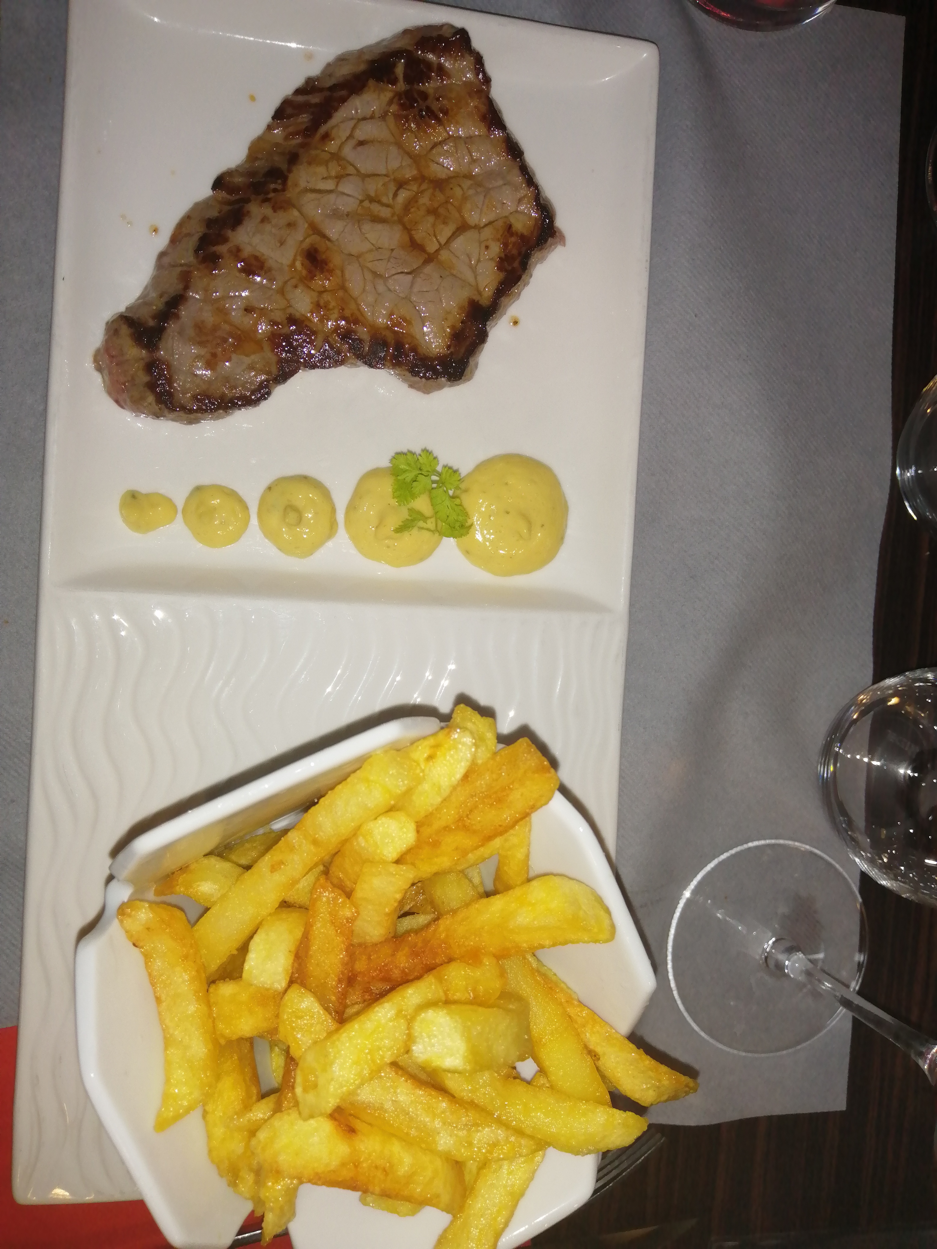 En milieu, pendant la visite a deux cantines de champagne un beau resto pour se reposer. Très bon saumon en entrée, excellent le veau en suivant. Bonne carte des vins. Un petit moins pour le service, même s'il y a du monde faut remplacer le pain et l'eau. Les desserts pas vraiment le top, par rapport aux premiers deux plats.