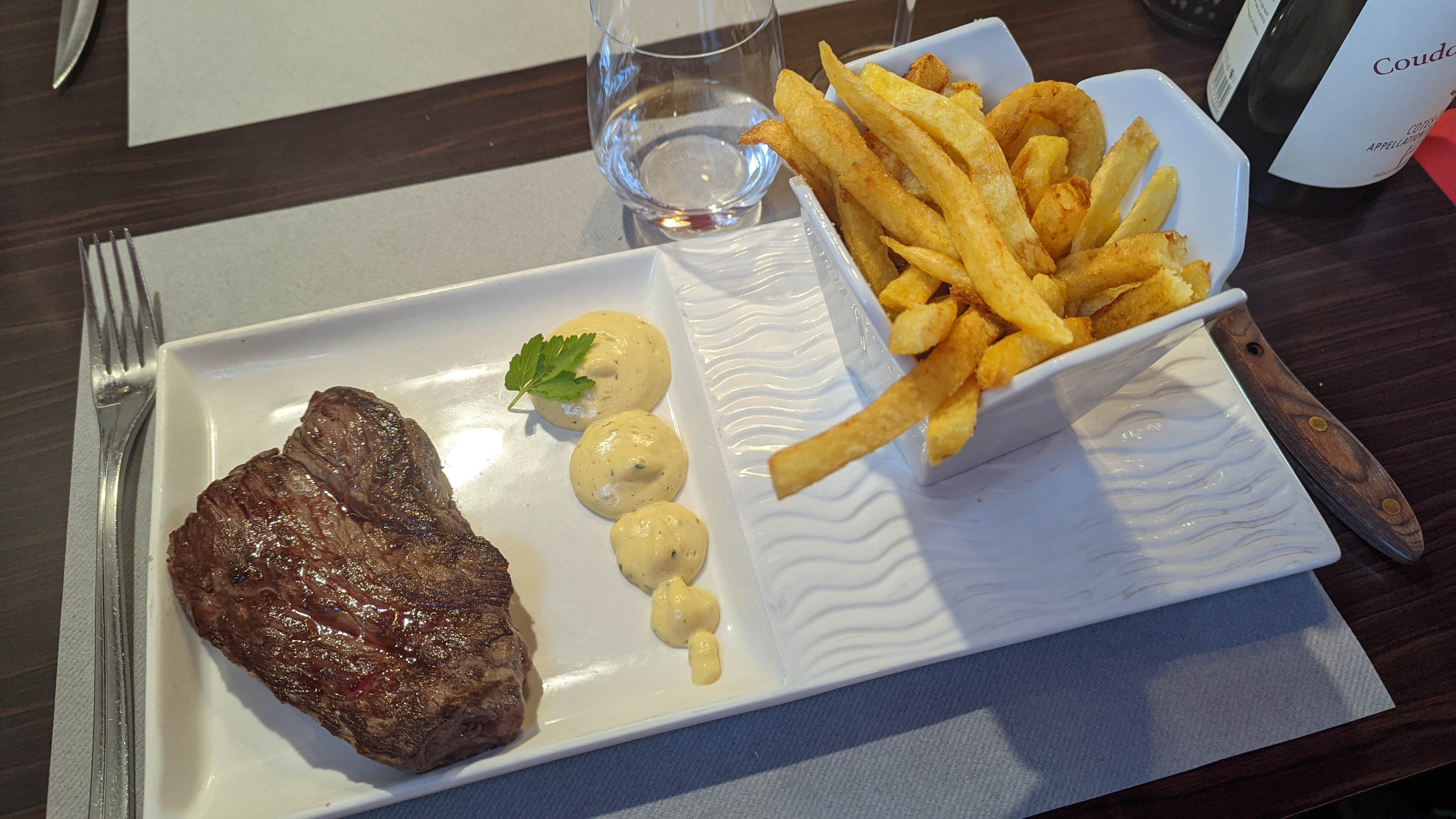 Lancement rapide w. steak, frites et béarnaise et un dessert tarte tatin. Excellent pour le prix. Ça vaut vraiment le détour.