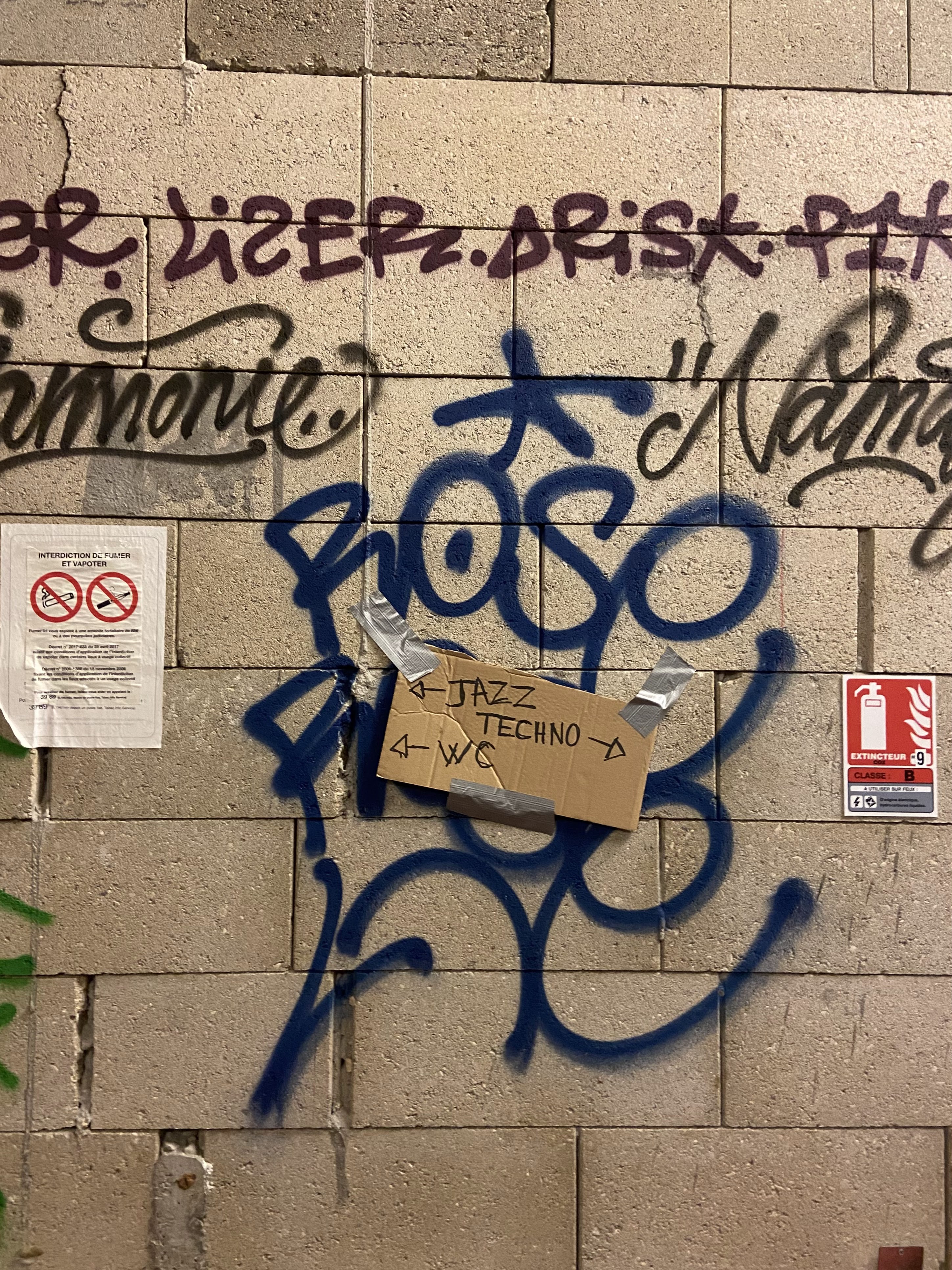 Le vigile locksé à l'extérieure est le plus sympathique de Paris! Il n'était surement pas vigile d'ailleurs mais plutôt responsable du lieu, comme quoi pas la peine de parler comme un chien pour être respecté! Bon par contre à l'intérieur CHHHHHUUT, des pancartes prônant le respect du jazz expérimental envahissent la salle, veillez à ne pas faire plus de bruits que la musique sous peine de vous faire reprendre par la barmaid. Cependant l'affiche collé au mur en descendant les escaliers nous a tous fait sourire, tous les bars devrait prendre exemple.. En bas l'espace est très cool, le dj était bon, peut être le son aurait il pu être un peu plus fort.