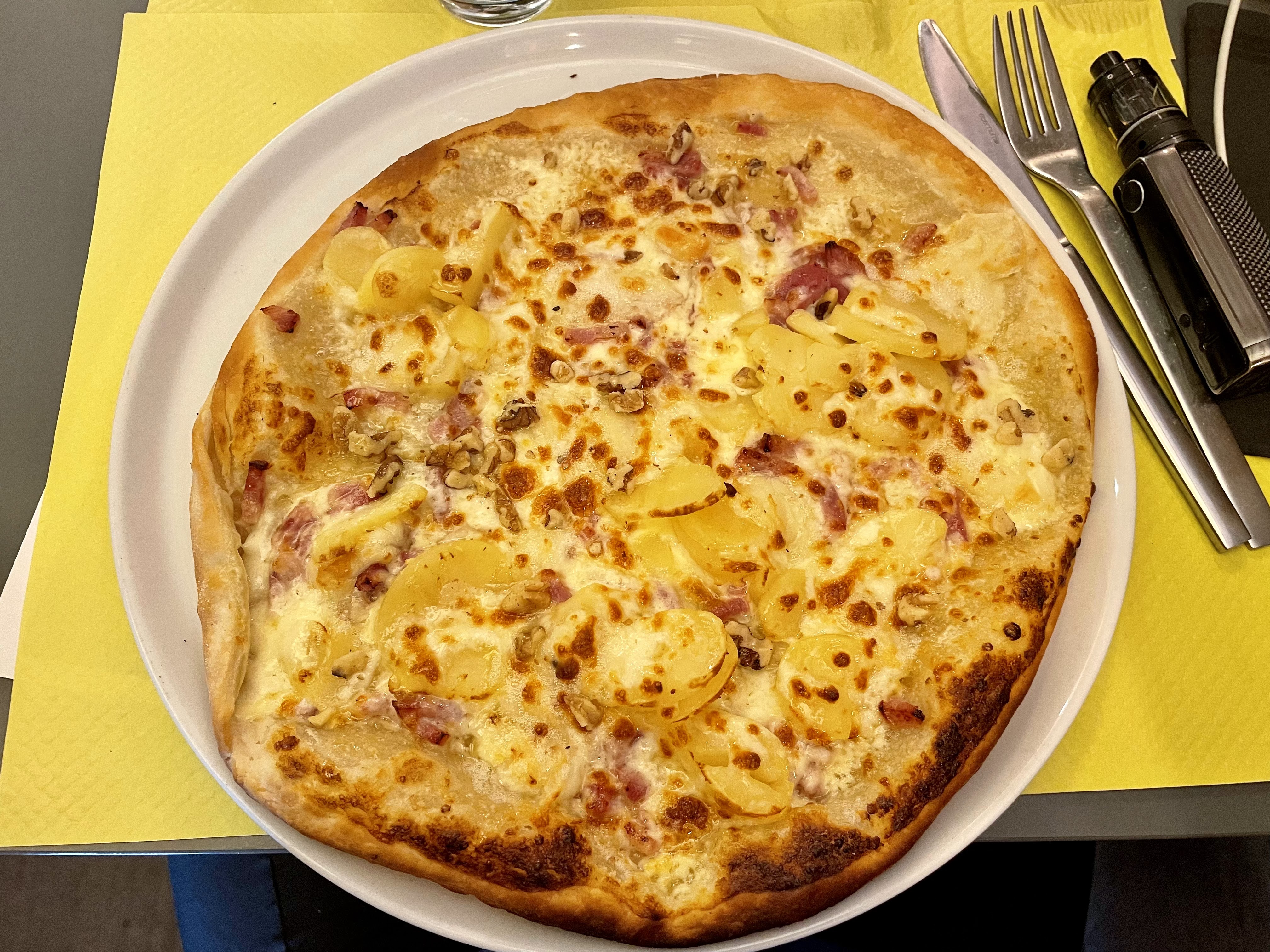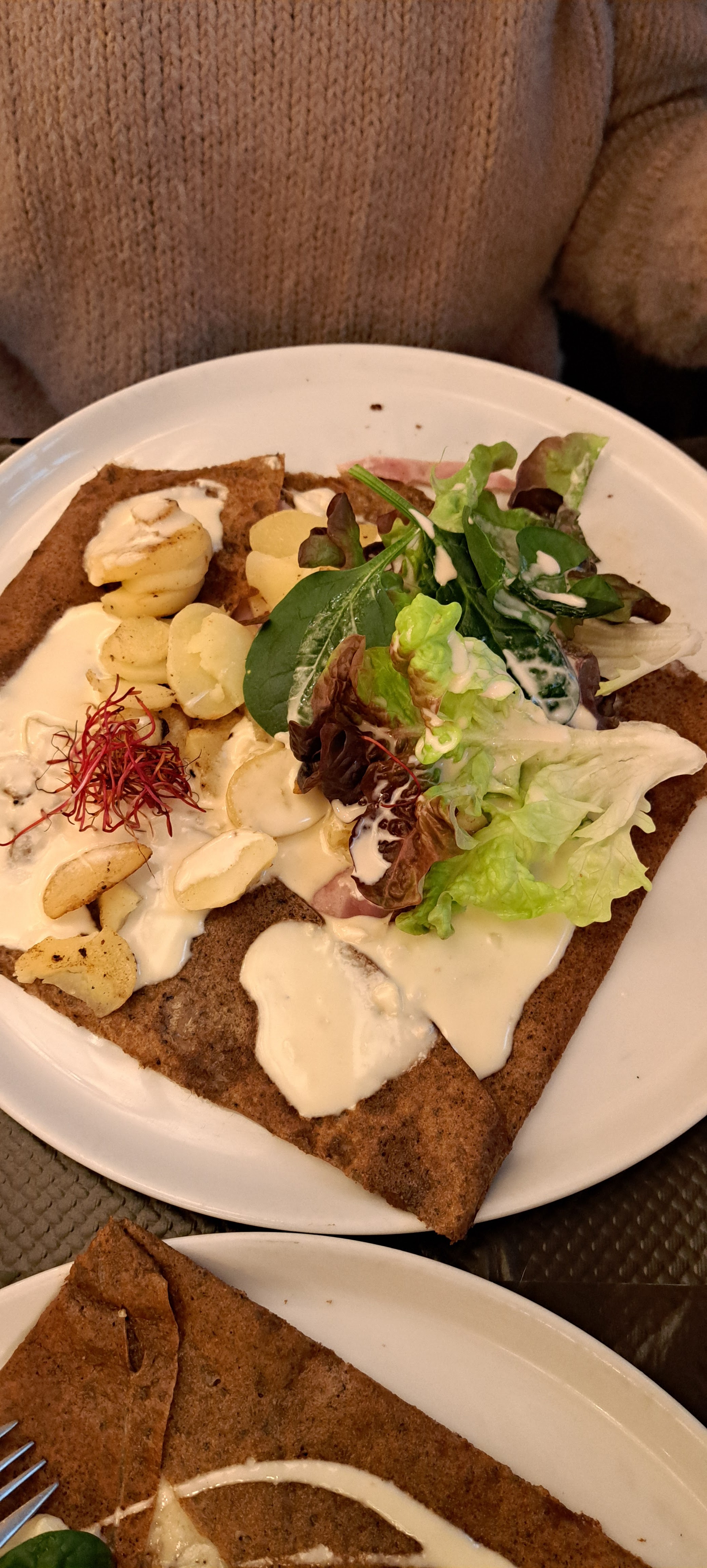 J’y été retourner pour la première fois il y a deux ans et demi presque où j’avais pris un feuilleté qui a été très bon, j’avais été agréablement surprise. Avant hier soir avec mes amis nous décidons de retourner dans ce petit resto sympa à la déco sobre et belle. Pour ma part j’ai pris une galette à la tartiflette. Quelle ne fut pas ma déception lorsque je commence à manger la crêpe 🥺 il y avait juste un bout de reblochon au milieu et le reste c’était de la crème avec des lardons et juste du gruyère dans la crêpe. Honnêtement j’ai été très déçu et j’ai trouver la crêpe très fade car manque de vrai fromage.. Peut-être faut-il revoir cette crêpe à la tartiflette ? Bon cela ne m’empêchera pas de revenir pour goûter d’autres plats. Sinon l’accueil est parfait et rapide, le patron est cool et j’allais oubliée, la petite part de pizza qui nous a été servie au début du repas est vraiment bonne.