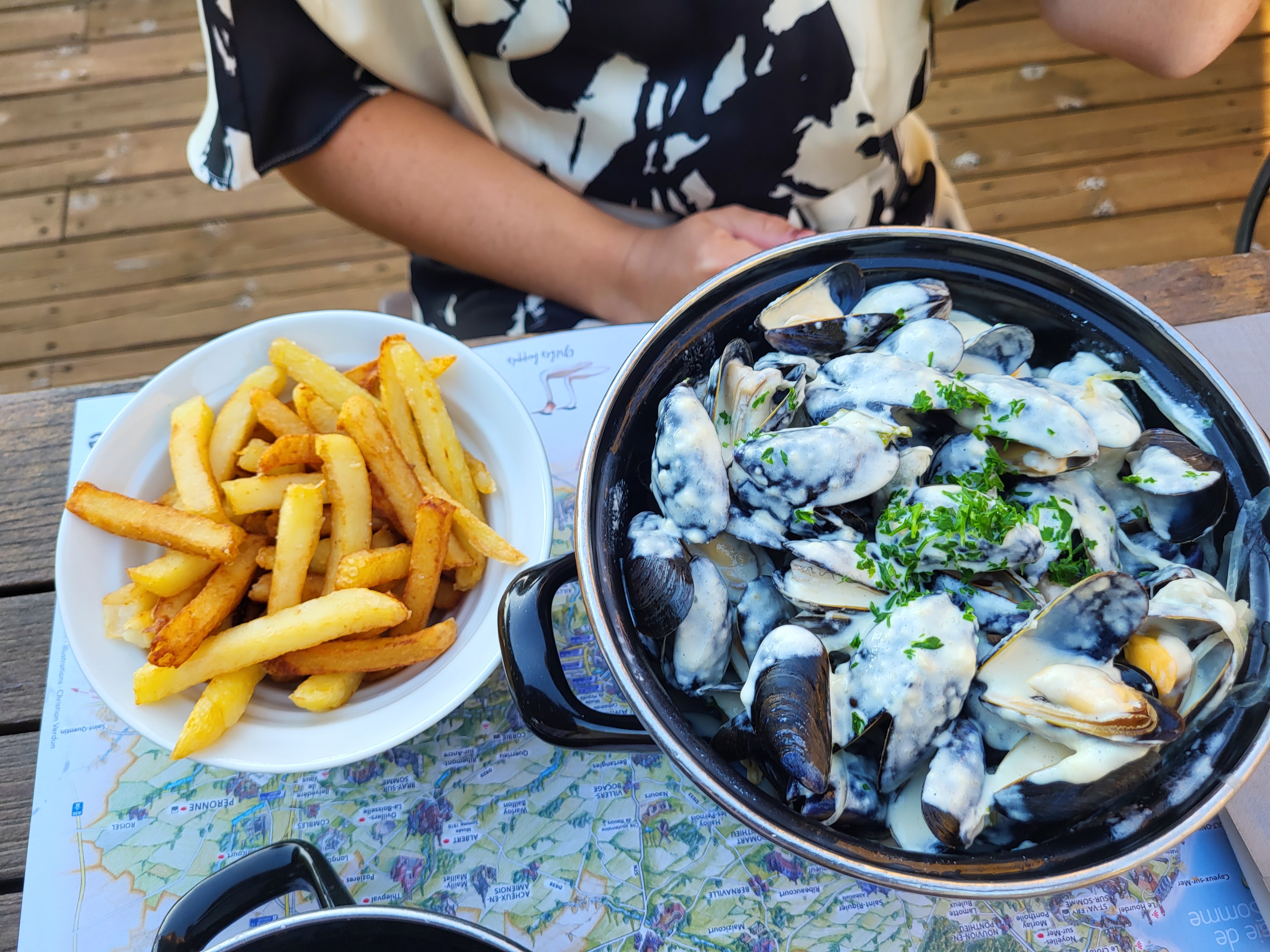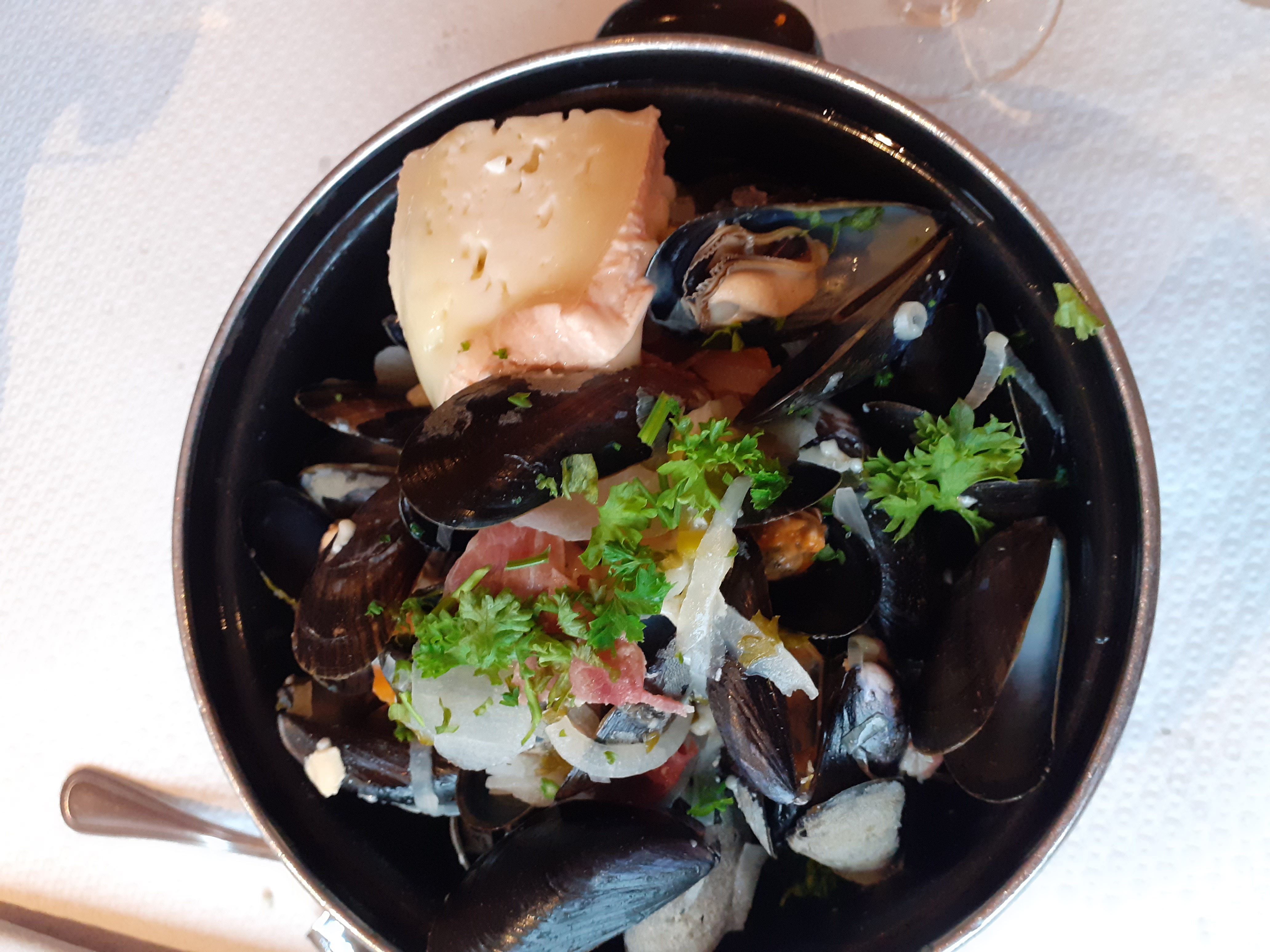 Bon rapport qualité/prix. 5 personnes. Moules du pays donc très fraîches, bonnes frites, desserts très bon ,.... Rien à dire de plus