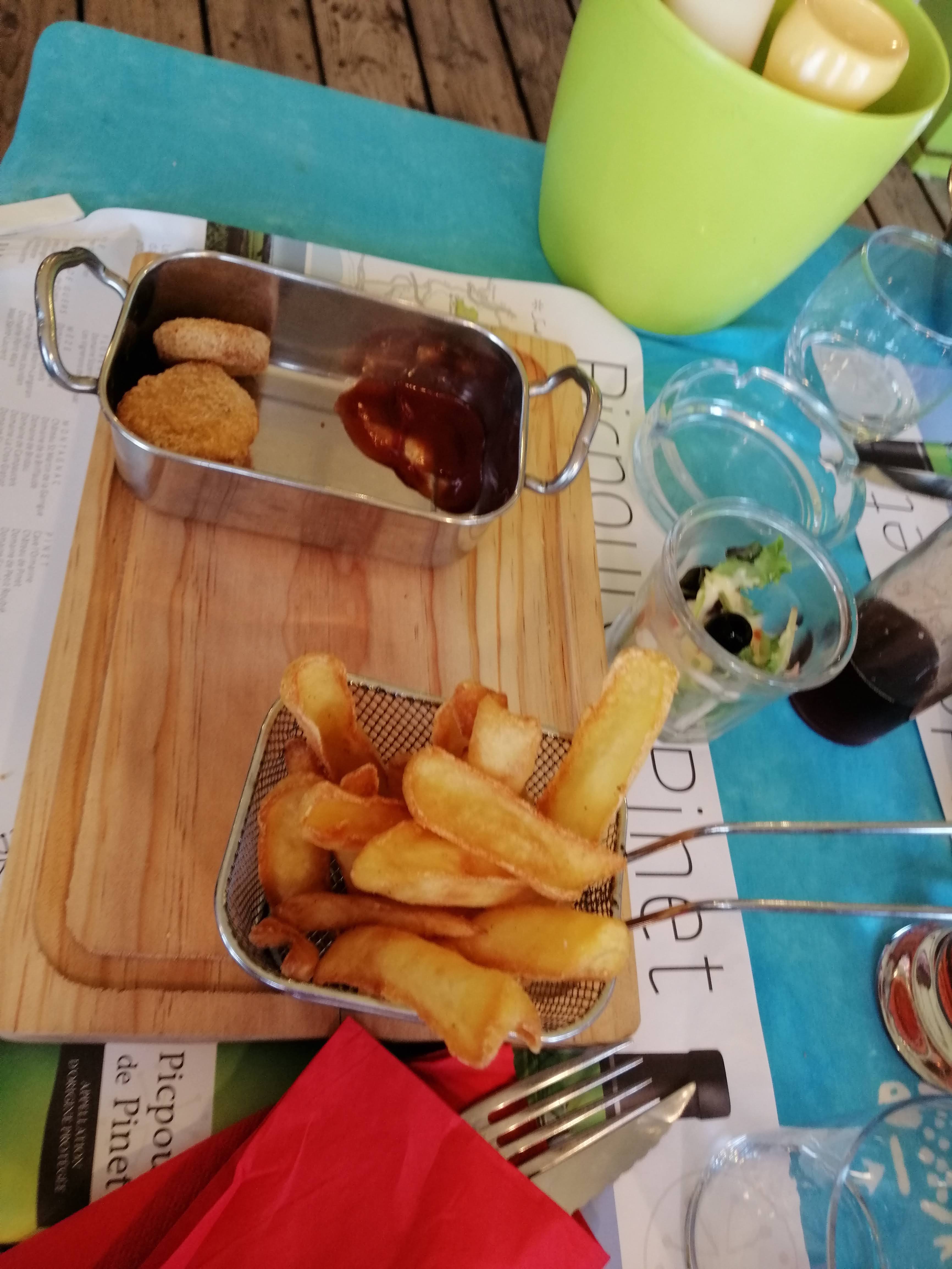 Service un peu mou, on est 6 à table, les boissons sont amenées une par une, les plats c’est un peu pareil y’en a 2 qui arrivent, on doit attendre pour que les autres soient servis. Pas de carte sur table, il faut lire les ardoises qui sont sur le côté du resto, ah ben si on est myope, faut aller les prendre en photo pour pouvoir commander quelque chose, pas vraiment pratique. Les serveurs sont gentils mais ne connaissent même pas la carte… On commande des moules frites, qui sont bonnes même si un peu trop salées, par contre beaucoup de moules vides, c’est un peu abusé pour 17€… les frites sont surgelées mais pas mauvaises. Le menu enfant, des nuggets surgelés et pas maison c’est dommage car c’est vraiment pas bon. Une assiette de fromage a 7€ pour 3 petits morceaux de fromage avec un verre de salade, grosse blague. Obligés de demander plusieurs fois pour qu’on nous amène le café. Une chaise haute a été fournie, ce qui est top mais alors chaise datant des années 70, on peut pas attacher bébé et la table ne tenait même pas, pas top niveau sécurité Après le restaurant est bien placé, les toilettes sont propres, mais bon pas un des meilleurs restaurants de Meze.