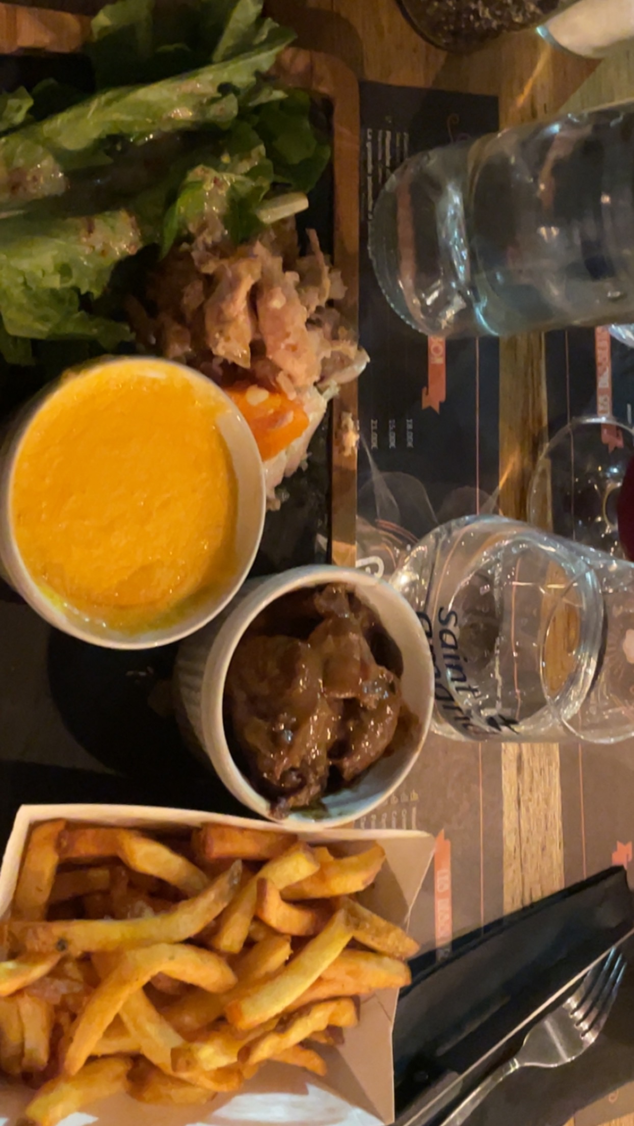 Petite soiree entre amis, c était très bon mais très peu de frites dans les assiettes. Nous avons demandé un peu plus de frites et surprise en supplément sur l addition. C est dommage